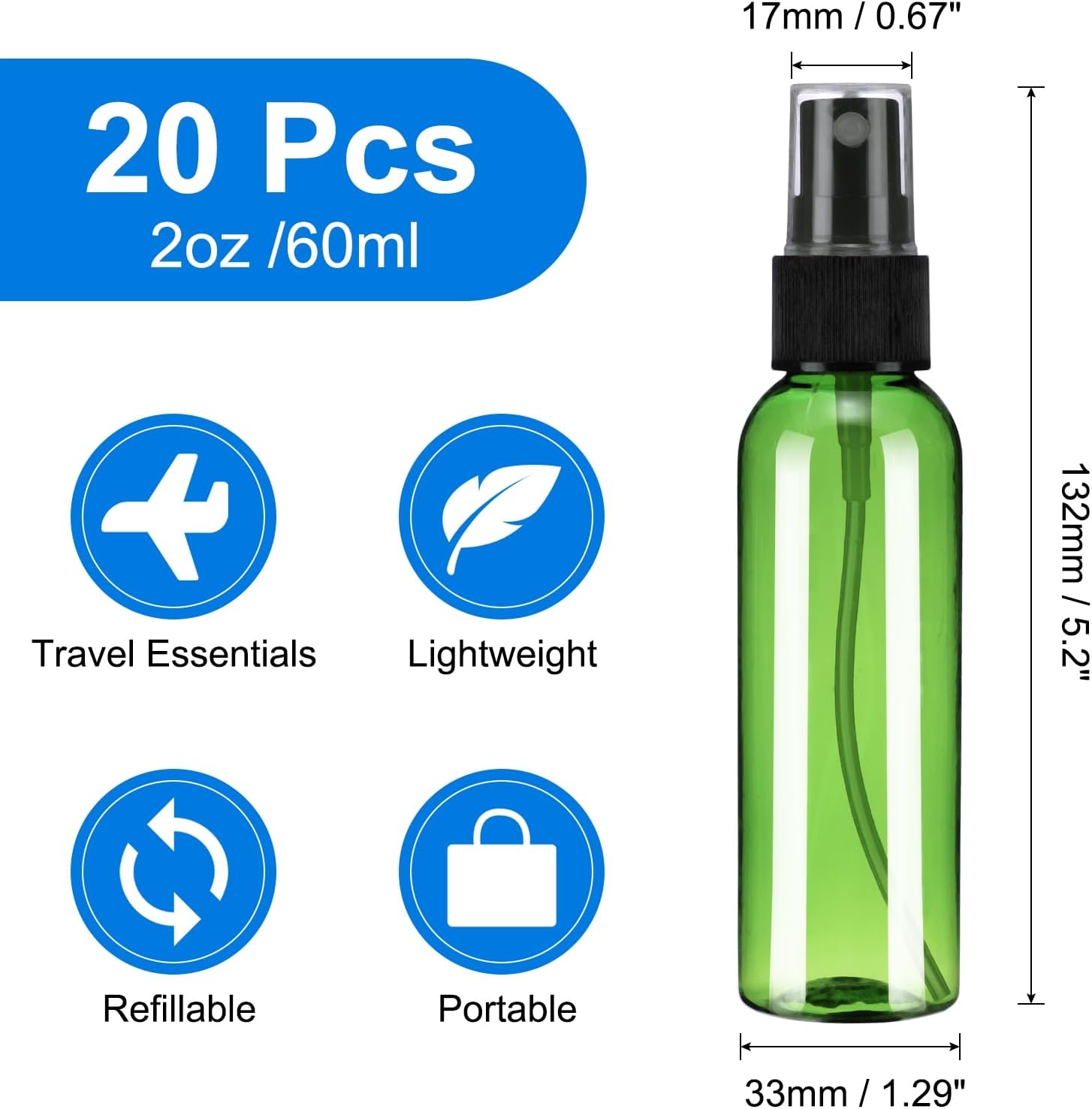 uxcell 20Pack Spray Bottles, 2 Oz/60ML Reusable Clear Empty Mist Plastic Mini Travel Bottle Set,Small Refillable Liquid Containers for Household Use, Essential Oil, Cleaning (Green Black)