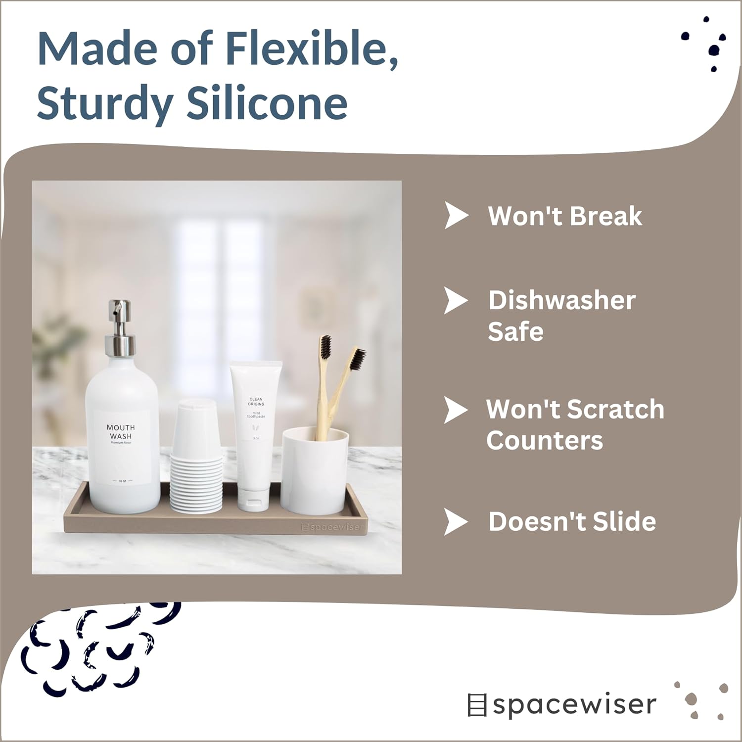 - Use It Anywhere - Choose the endlessly useful and aesthetically pleasing tray that works anywhere. Spacewiser Original Silicone Trays are made of premium food grade silicone, without the addition of potentially unsafe thickening and hardening agents or chemicals. They’re shatterproof, waterproof, slip-resistant, heat resistant to 425F, and dishwasher safe. They’re the perfect silicone tray for kitchen counter, vanity tray, coastal bathroom tray or kitchen soap tray.