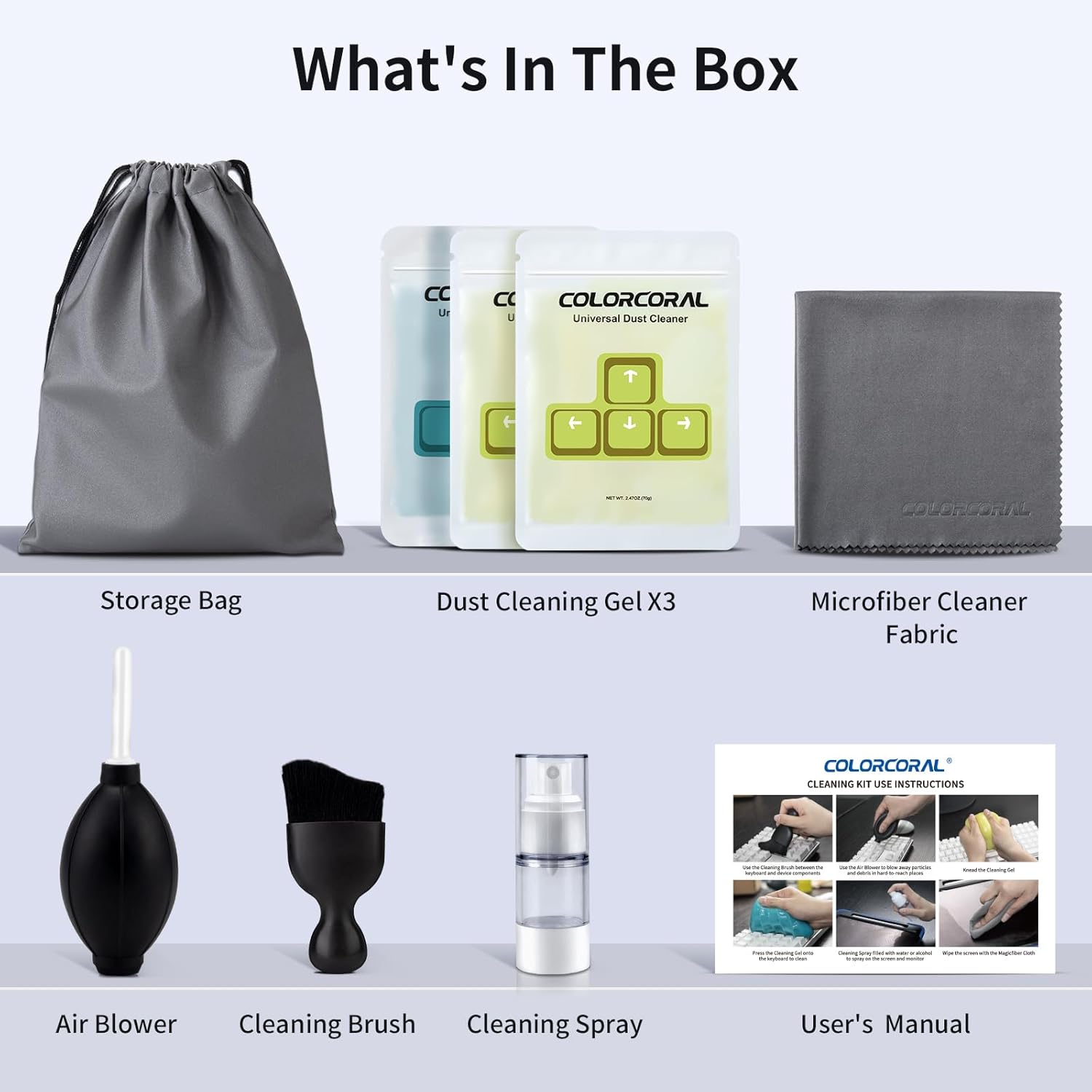 - 💡【Laptop Cleaning Kit】: Computer cleaning kit includes COLORCORAL Keyboard Cleaning Gel*3, Air Blower, Cleaning Brush, Cleaning Spray, Microfiber Cleaner Fabric, and Storage bag.