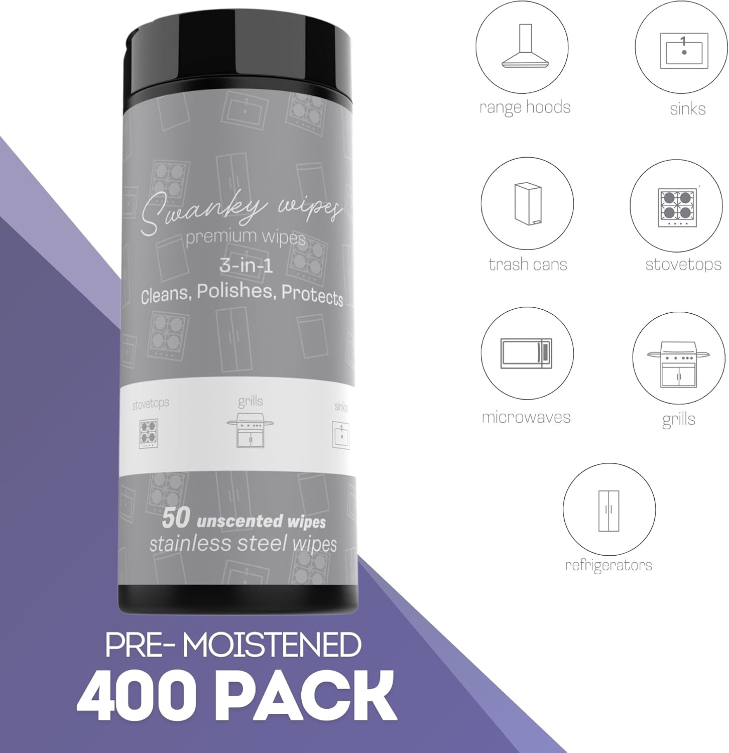 • PRODUCT SPECS - Swanky Stainless Steel Cleaning Wipes come in a pack of 400 soft, non-scratch wipes. Each wipe is pre-moistened and ready to use, making them a convenient addition to your cleaning supplies. Ideal for keeping your stainless steel appliances looking polished and clean.