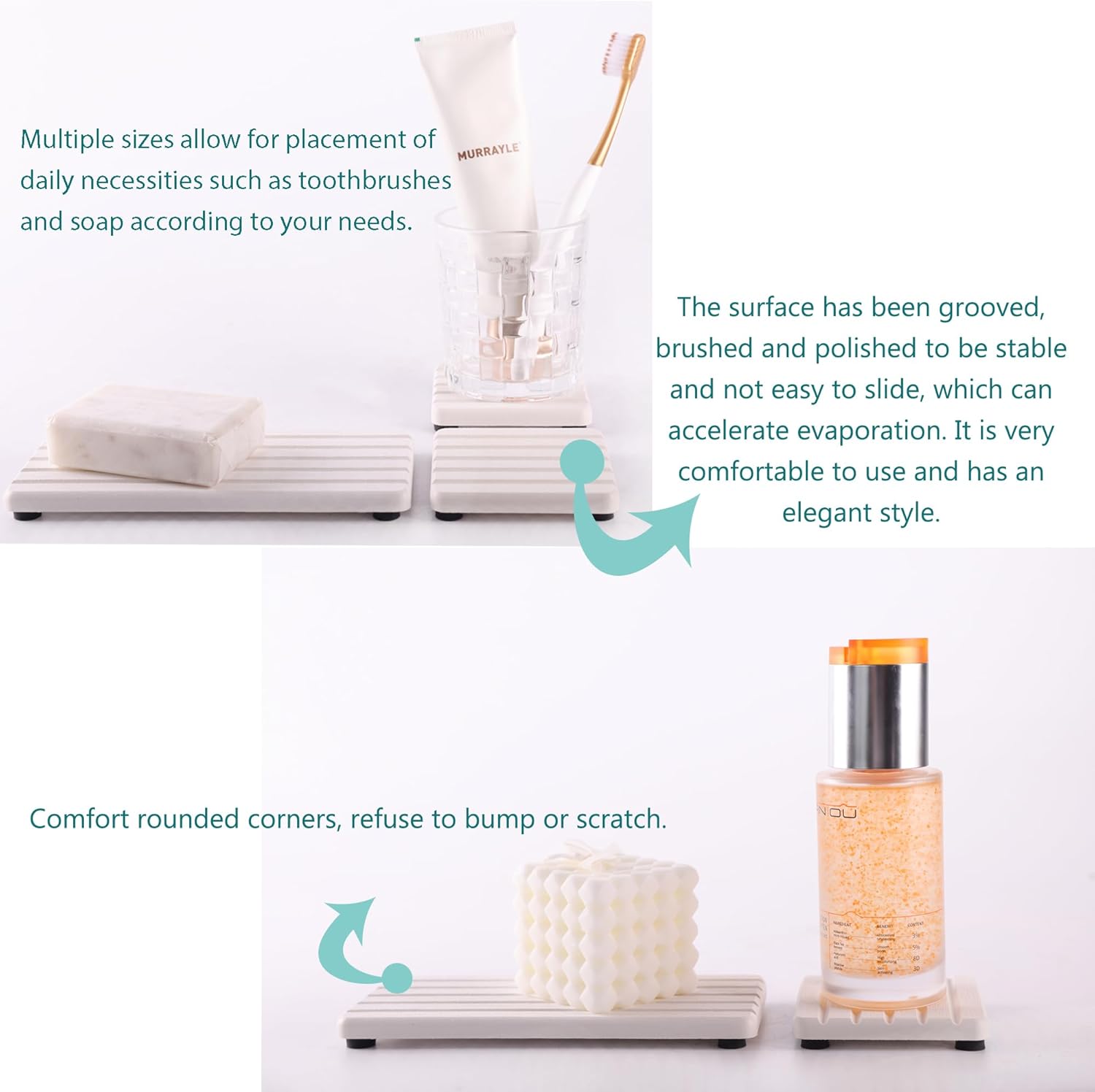 - Striped ditch design speeds up the absorption and volatilization of water, and has anti-skid effect.Silicone footpads boost the slip-resistance of coasters while keeping them out of the bathroom vanity. This design improves the contact surface between the diatomaceous earth coaster and the air, prevents moisture, and prolongs the service life of the product.