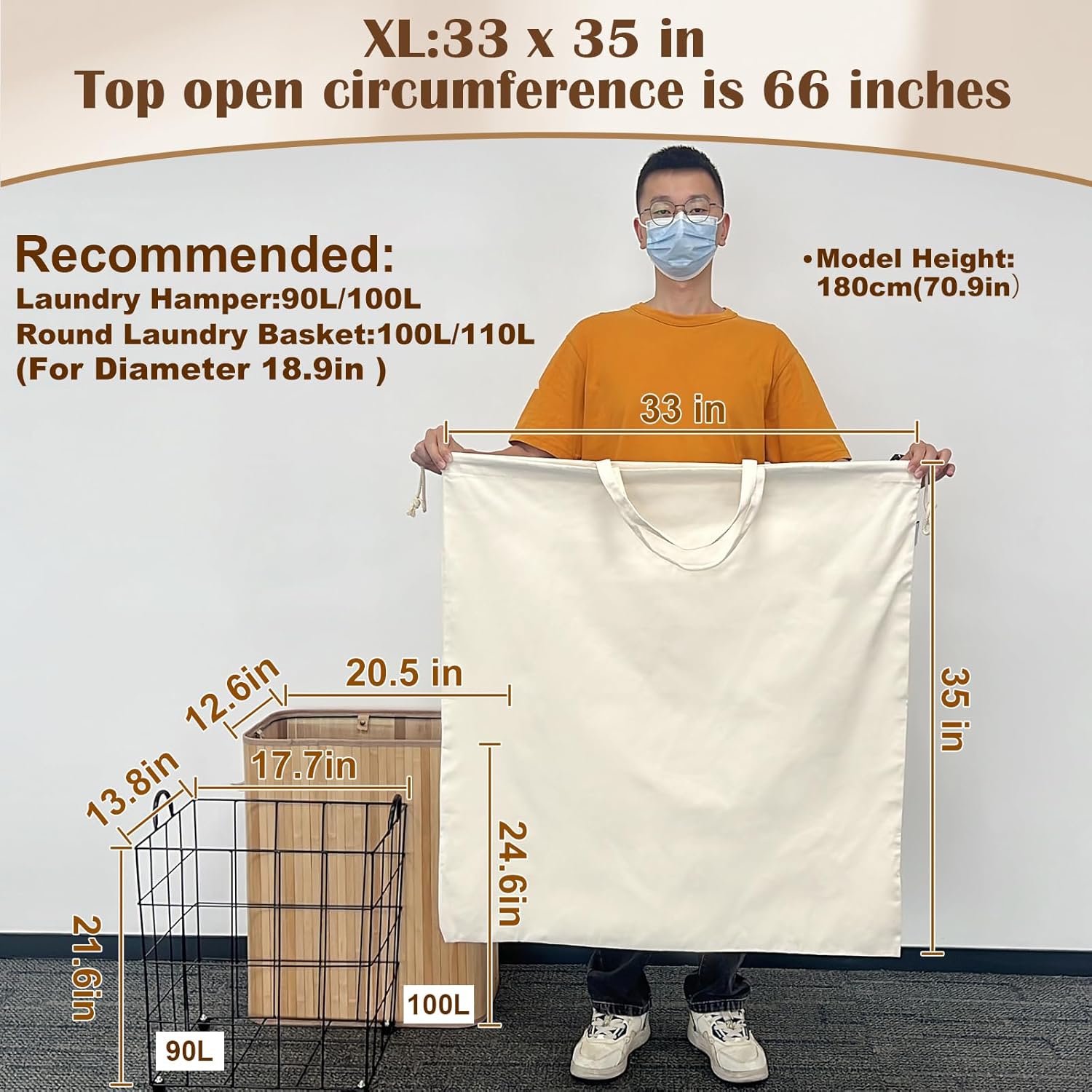 - BIG Size 33"Lx35"H: XL bag Top circumference is 66in(168cm), very large size, fit for most 90/100L laundry hamper and diameter 18.9" round laundry basket- PLEASE VERIFY SIZE BEFORE PURCHASE