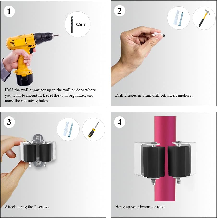 - Easy to install - You can easily install 3-H broom holder wall mount in a few seconds, This broom hanger wall mount is suitable for all types wall, no matter smooth surface or rough surface. Such as:marble, wood, metal, ceramics, ceramic tiles, acrylic, plastic surface, non-paint walls, cement, wallpaper, plaster, paint, waxing and brick wall, so please choose your ideal installation location.
