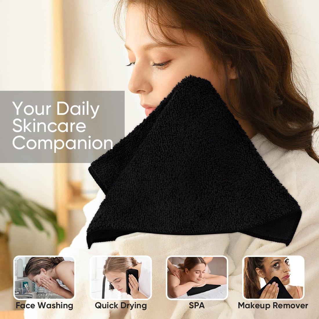 - Versatile Usage: Beyond its use as a washcloth or makeup remover cloth, this black towel serves multiple purposes around the house. Use it for dusting surfaces, cleaning spills, polishing glassware, and more.
