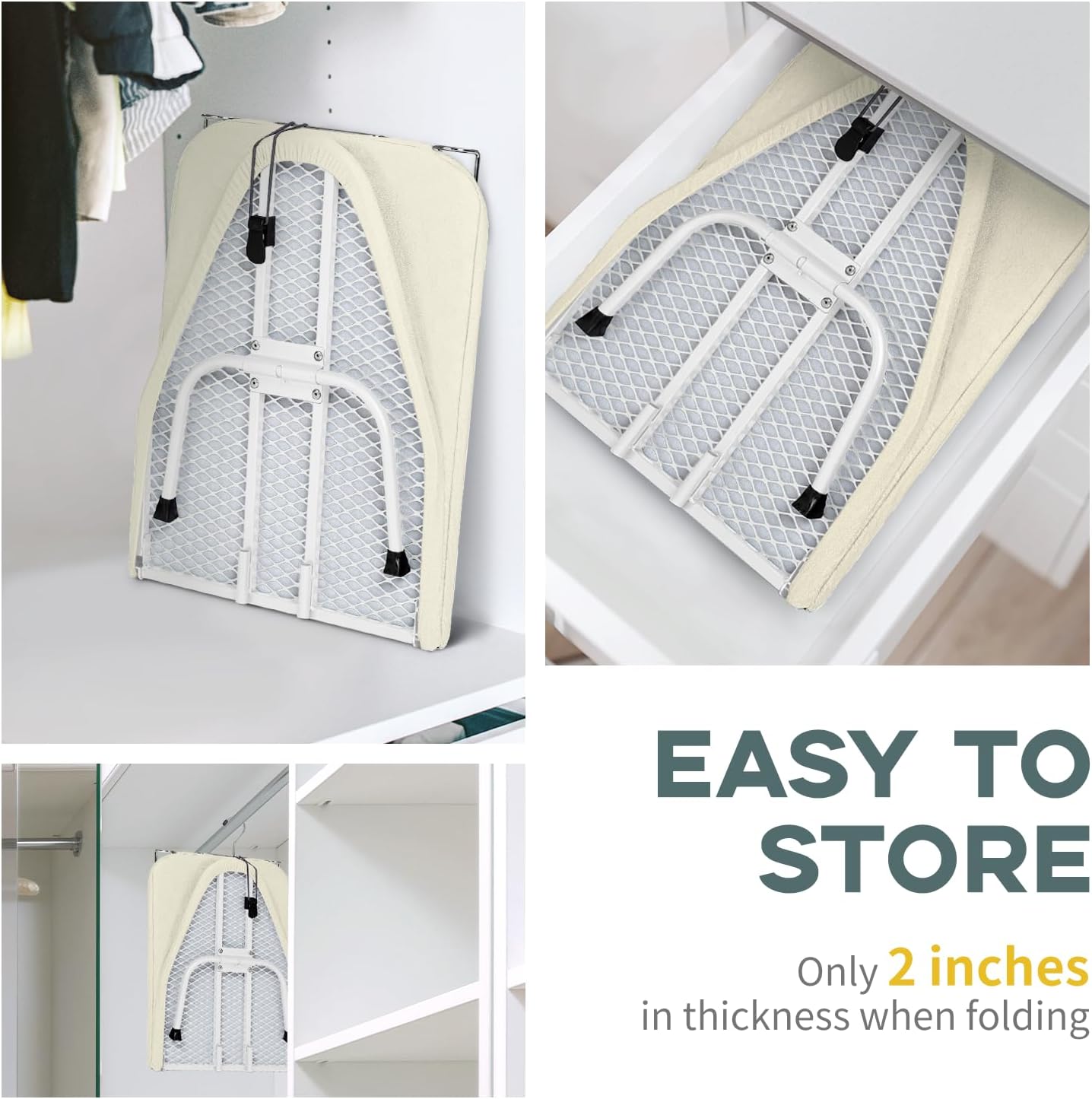 - Easy To Store: This foldable mini ironing board can be folded in half quickly for easy storage in cabinet, drawer or just hang it in the closet