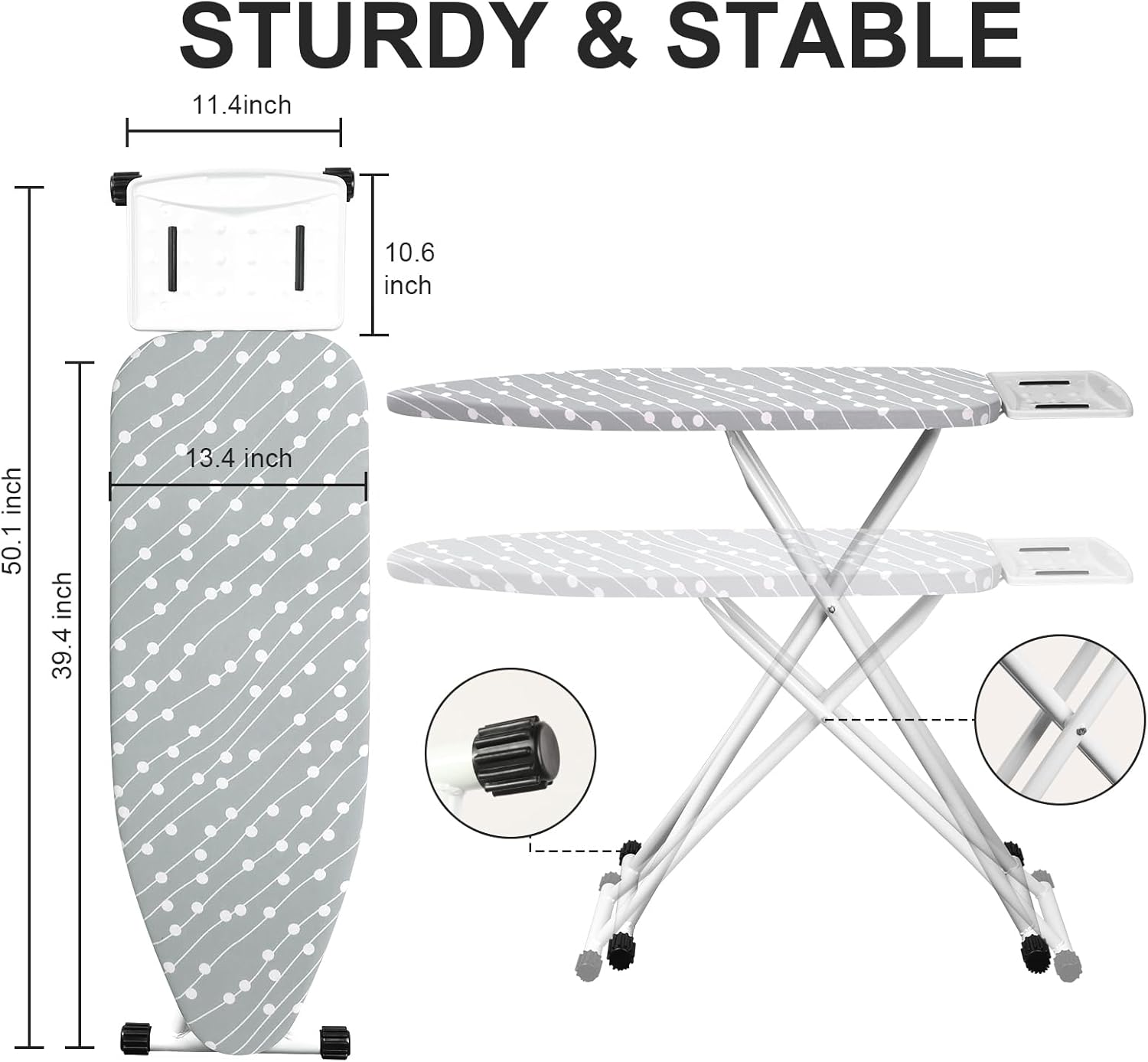 - Portable Iron Stand: Our iron board not only has a wide ironing surface of 39.4x13.4 inches, but also provides ample space for ironing various clothes. And it is also equipped with an iron stand, which can place the iron to better maintain good heat dissipation and help eliminate wrist fatigue during overuse.