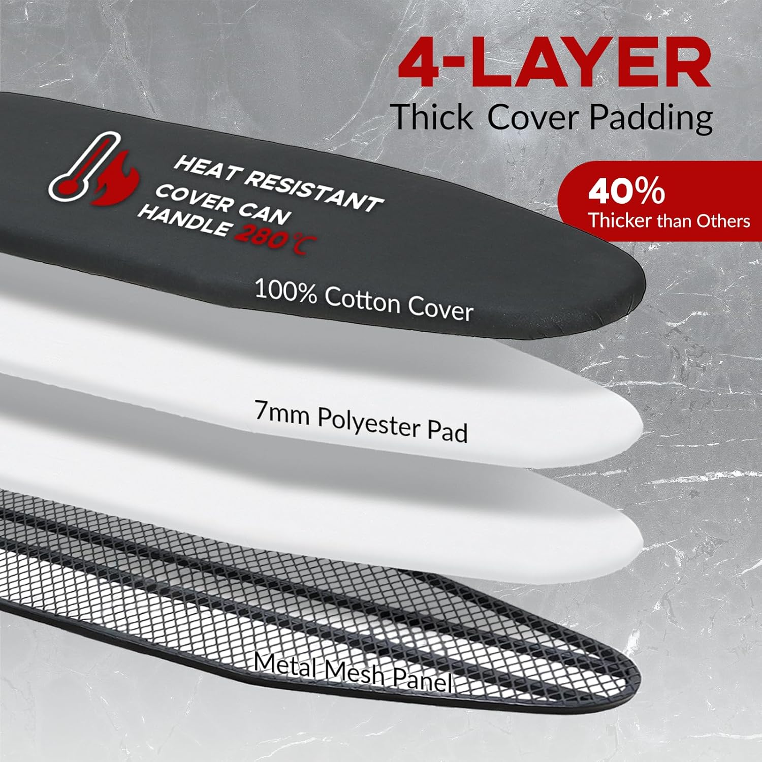- Ironing Board Cover and Pad: Extra thick heat-resistant ironing board cover which is made of 100% cotton cover with two layers of 7mm padding absorbs heat and creates an ideal ironing surface, making the ironing task quicker and easier