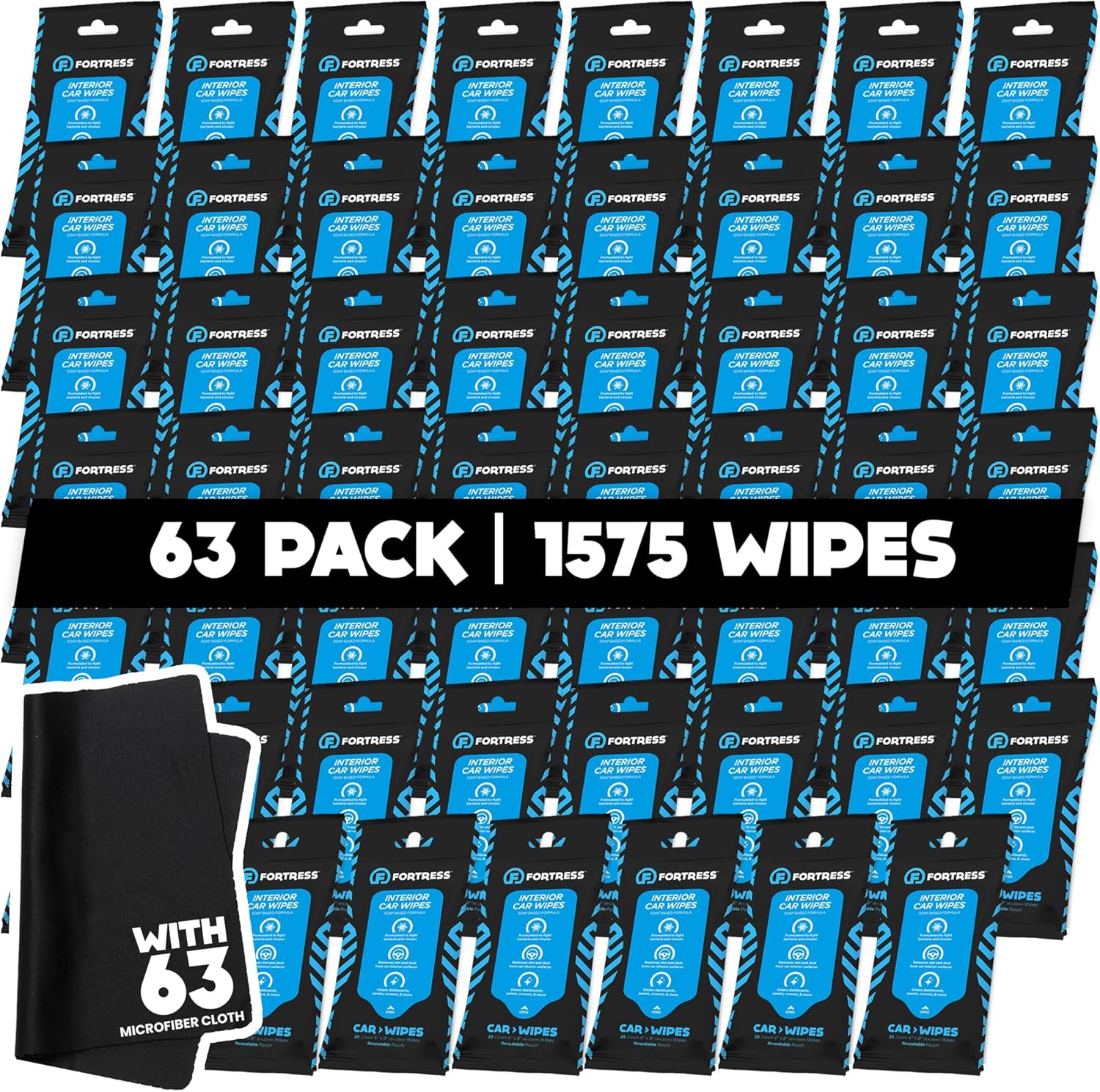 Fortress Car Interior Wipes with Microfiber Cloth (25 ct, Pack of 63) for Car Interior Cleaning, Dashboard, Seats, Detailing, and Steering Wheel [Travel Size] Skin-Safe Car Interior Cleaner Supplies