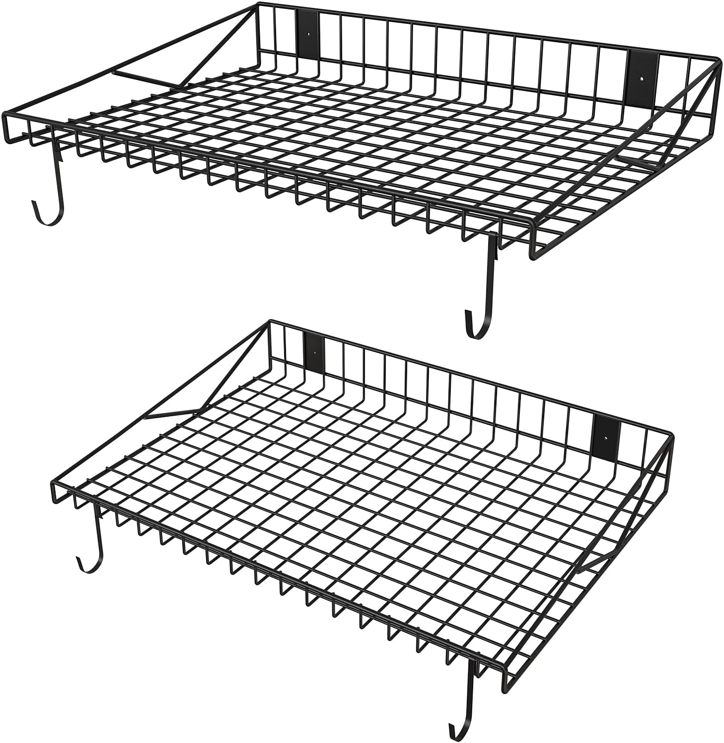 2 Pack Garage Wall Shelf, Garage Wall Mounted Shelving, Heavy Duty Floating Shelves With 4 Hooks, Loads 90 LBS Black Wall Shelves Mesh Storage Rack for Office, Basement, Wall Cabinet and Kitchen