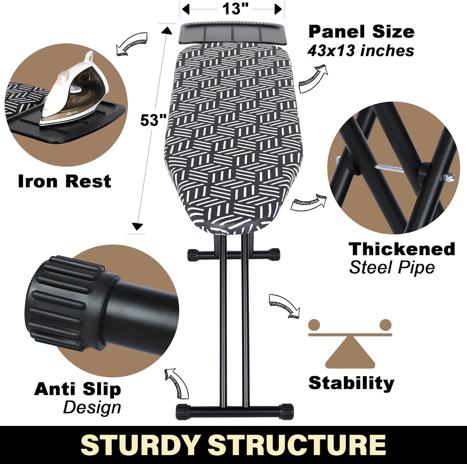 caius Ironing Board with Steam Iron Rest, 43"x13" Extra Thick Padded Cover, Compact and Space Saver Iron Board Full Size, Easy to Fold, Adjustable Height, Sturdy Metal Frame