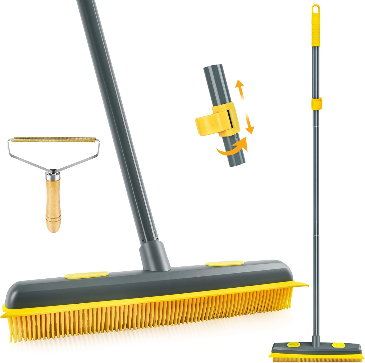 NEWE Rubber Pet Hair Removal Broom with Lint Fur Remover Tool, 57.5 inches Long Handle Silicone Carpet Brush Rake with Built-in Squeegee for Cleaning Rug, Tile, Floor (Gray Yellow)