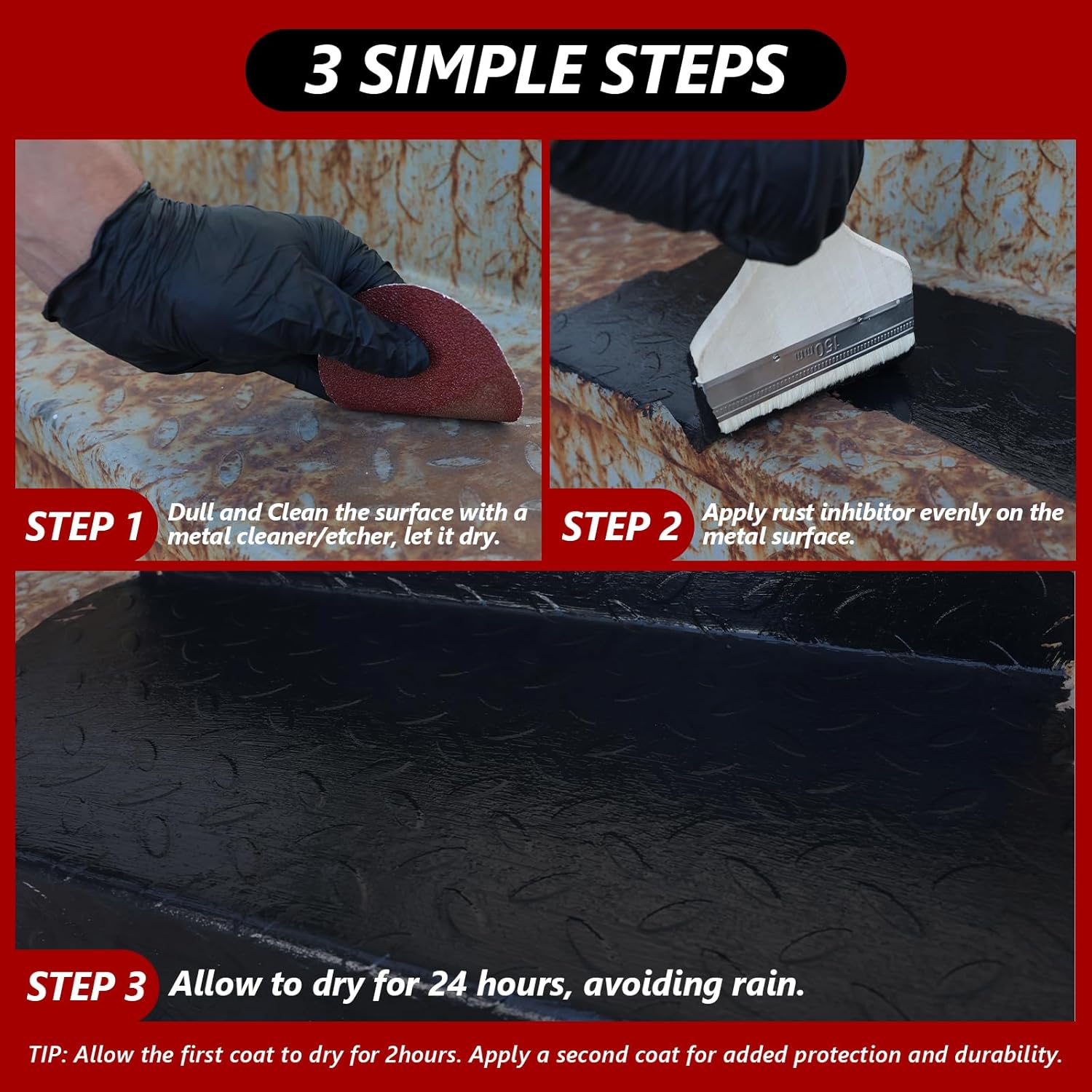 - EASY TO APPLY: Remove rust, oil and foreign matter from the metal surface, wipe dry, then apply the rust converter evenly with a brush. For best results, always apply thin coats, always apply thin coats, a minimum of two, allow 24 hours for drying and forming a protective film. Our rusty metal primer can cover about 6-8 square meters per liter. For heavily rusted or rough surfaces, the coverage may be reduced to 4-6 square meters per liter.