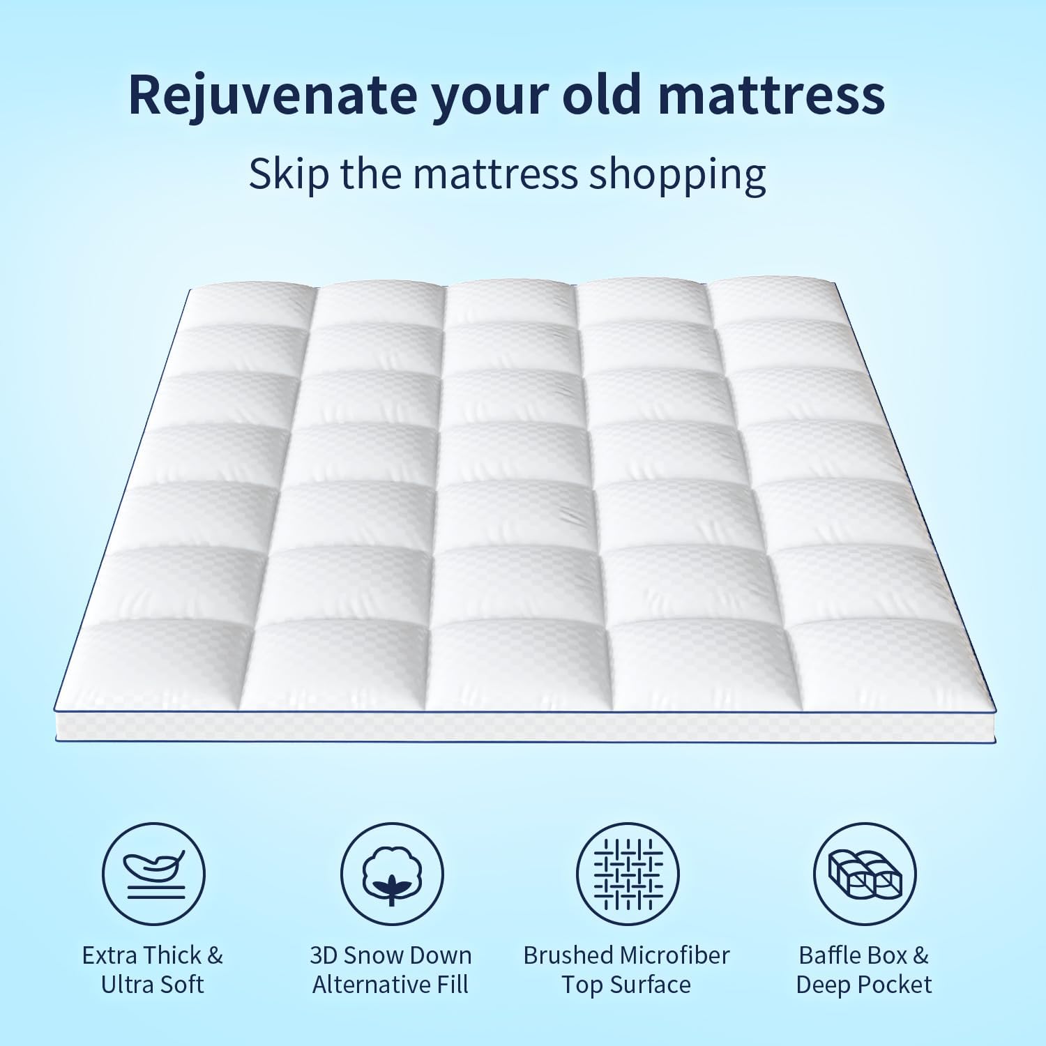 King Mattress Topper Extra Thick Pillowtop Cooling Mattress Topper Plush Mattress Pad Cover Protector with 8-21 Inch Deep Pocket 3D Snow Down Alternative Fill