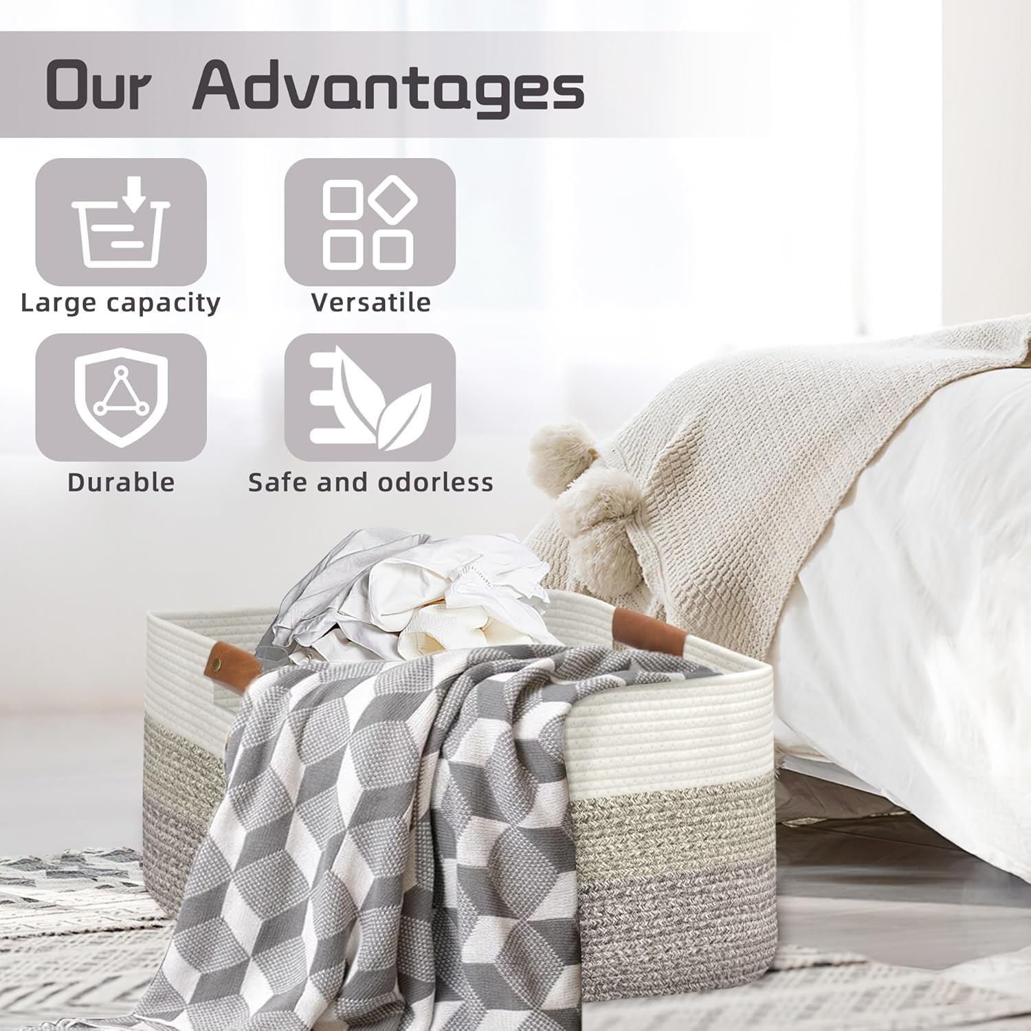 - Decorative & Versatile: Pure Natural Material Elevates Any Space - Laundry, Toys, or Blanket Storage Solution.The elegant leather handles not only take care of your hands but also add a distinctive highlight to our large baskets.