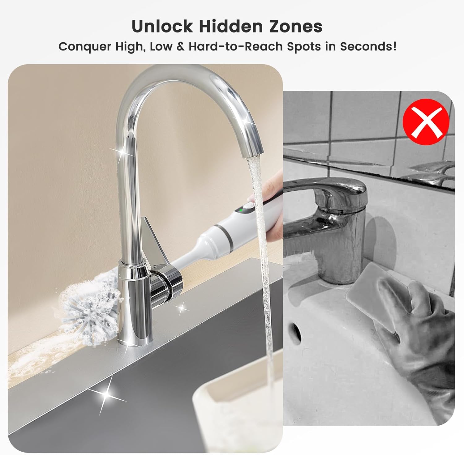 - 6 Replaceable Heads & Easy to Storage: Catering to all cleaning needs - Includes toilet brush, curved brush (for corners), column brush (tile gaps), scrubber pad (dishes), microfiber brush (delicate surfaces), and sponge head. Double hook attachment easily stores brushes without taking up too much space.