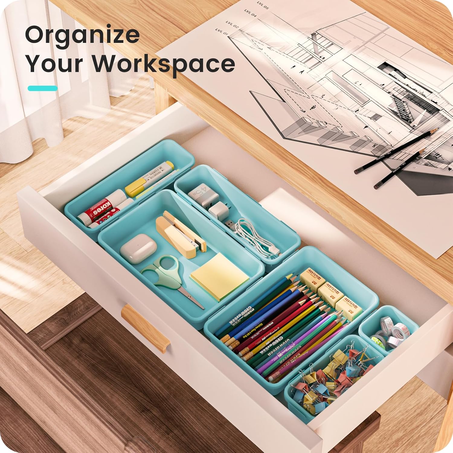 - 【28Pcs & 4 Sizes】 ---- One set includes Blue-Green 28pcs storage bins in 4 different sizes, which help you customize combinations to store items and organize drawer in shelves/closets/cabinets/dressers. Includes: 9 inch*6 inch*2 inch, 8 Long sizes:6 inch*3 inch*2 inch, 4 Medium sizes:9 inch*3 inch*2 inch, 14 Small sizes:3 inch*3 inch*2 inch.