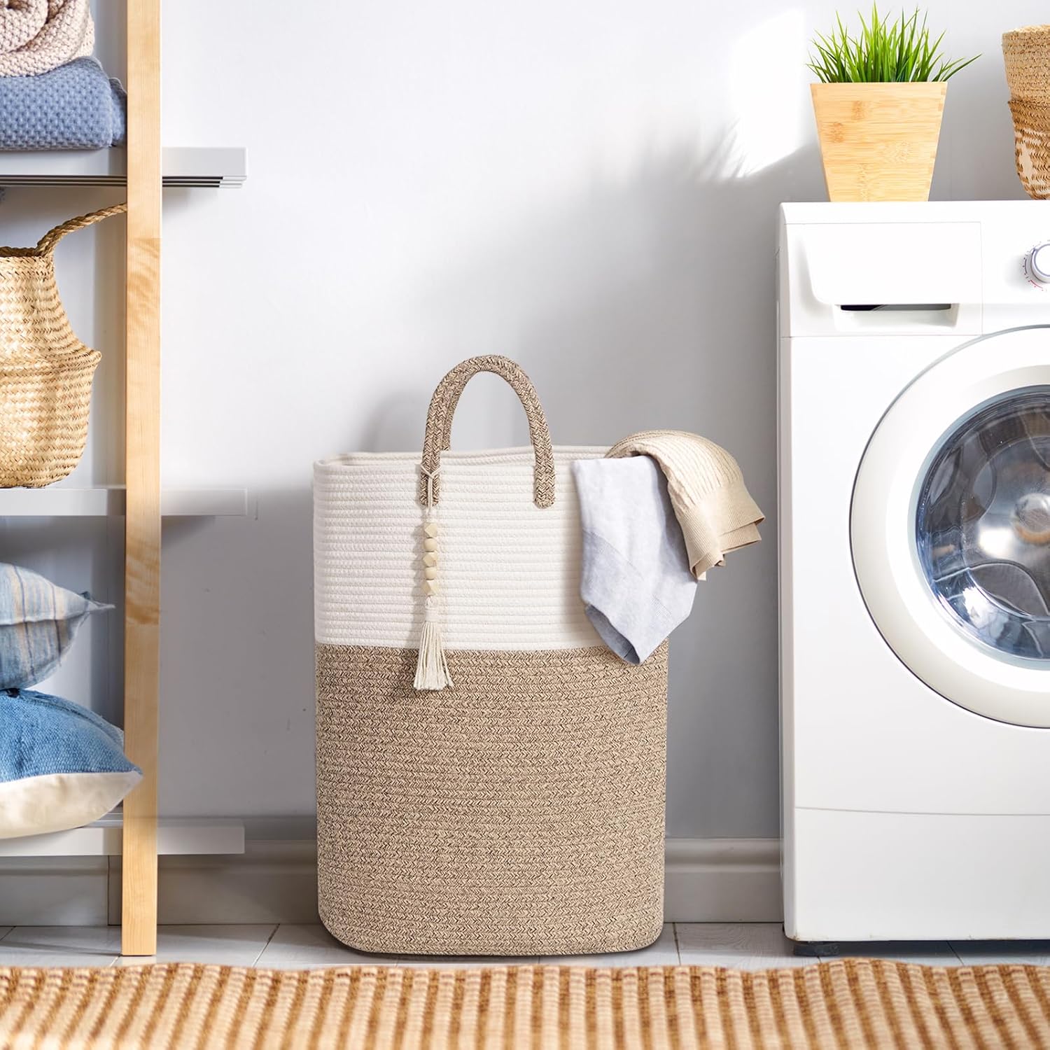 - š[DURABLE, BREATHABLE & SKIN - FRIENDLY COTTON]: Made of sturdy and odor-free rope cotton, woven laundry basket has a solid addition to any space. Tall laundry basket quite sturdy and spacious, capable of holding a good amount without losing its shape, which adds to its practicality.