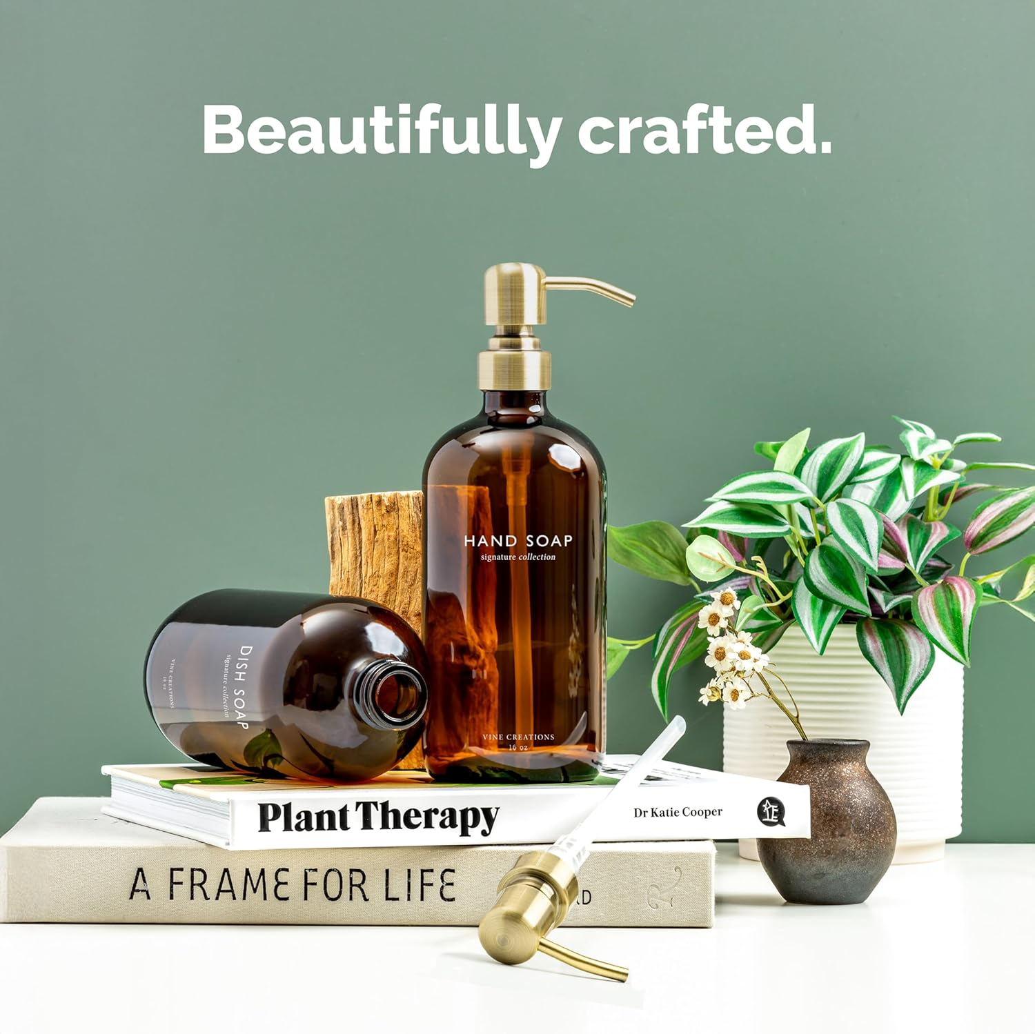 Vine Creations Amber Glass Soap Dispenser Set, Dish Soap and Hand Soap Dispenser Set with Stainless Steel Pump, 16 oz Glass Dispensers for Kitchen or Bathroom Decor (Amber Bottle/Brushed Brass Pump)