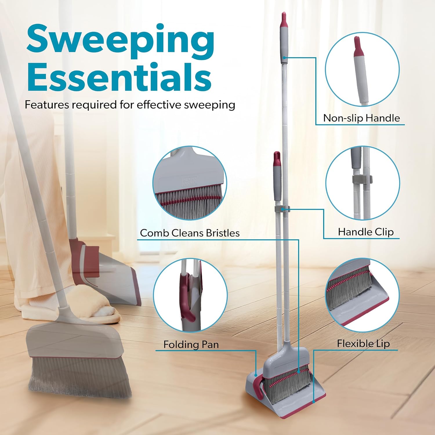BLACK+DECKER Butler Broom & Dustpan Set - Stand-Up Design - Lightweight, Space-Saving Combo for Kitchen, Living Room, Bathroom, Lobby Floors - Home Cleaning Essential, Light Gray/Burgundy