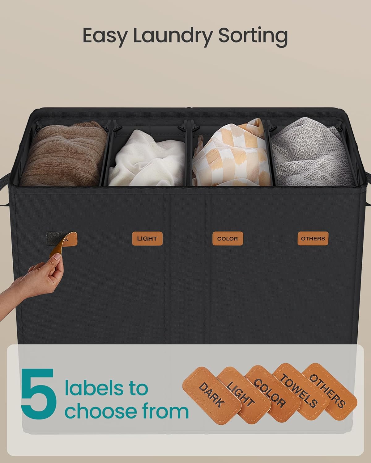 - 4 Compartments for Easy Sorting: Equipped with 5 labels (DARK, LIGHT, COLOR, TOWELS, OTHERS) and 4 compartments, this laundry basket makes it easy to sort your laundry, saving you time on laundry day