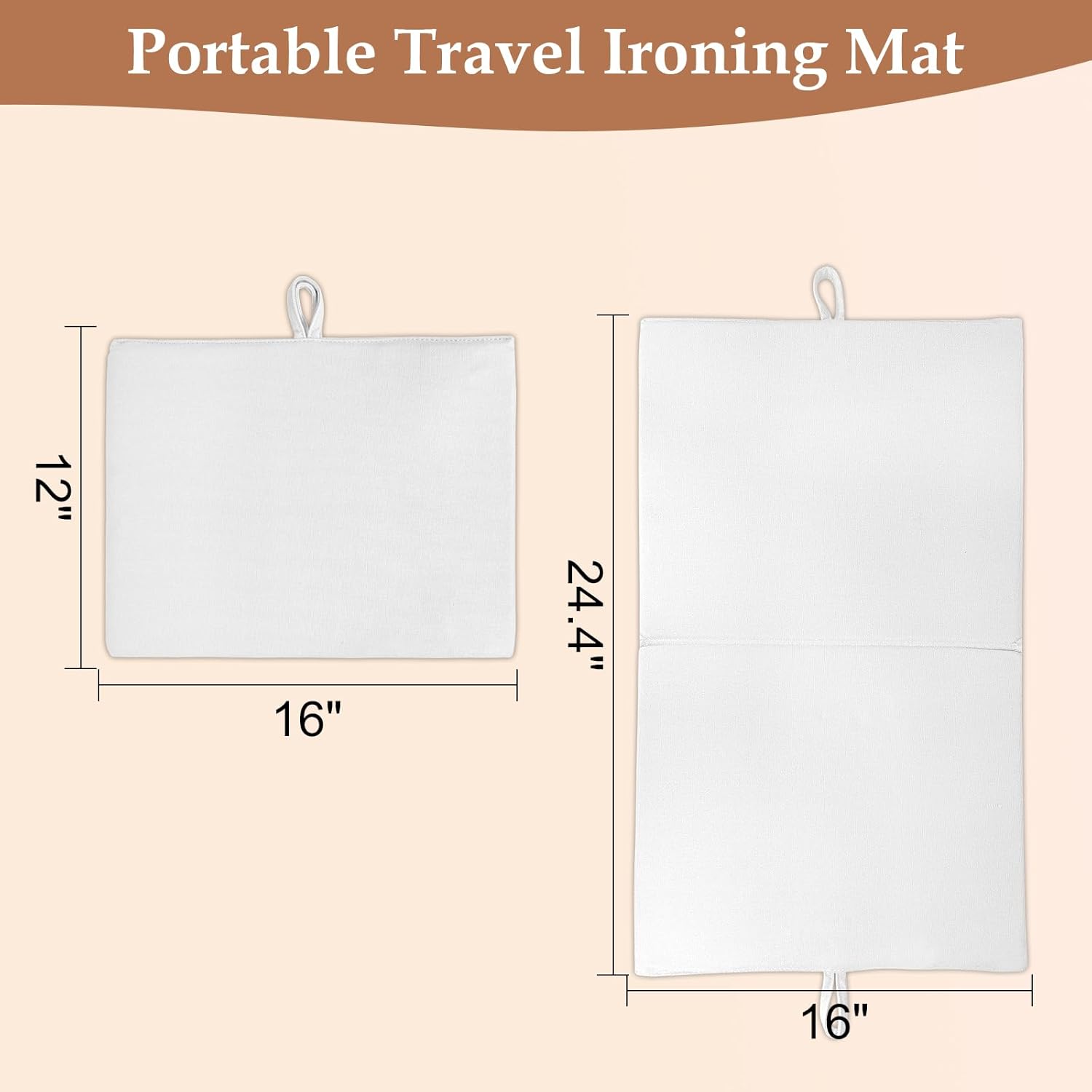 - Size & Space Saving: 24" x 16", 0.5 inch thick. Our Cotton mat is portable and versatile, easily fitting into a handbag or piece of luggage. Its hook and foldable design also allows the ironing pad to be stored or hooked conveniently without taking up additional storage space. Perfect for home, office, dorm, travel use.
