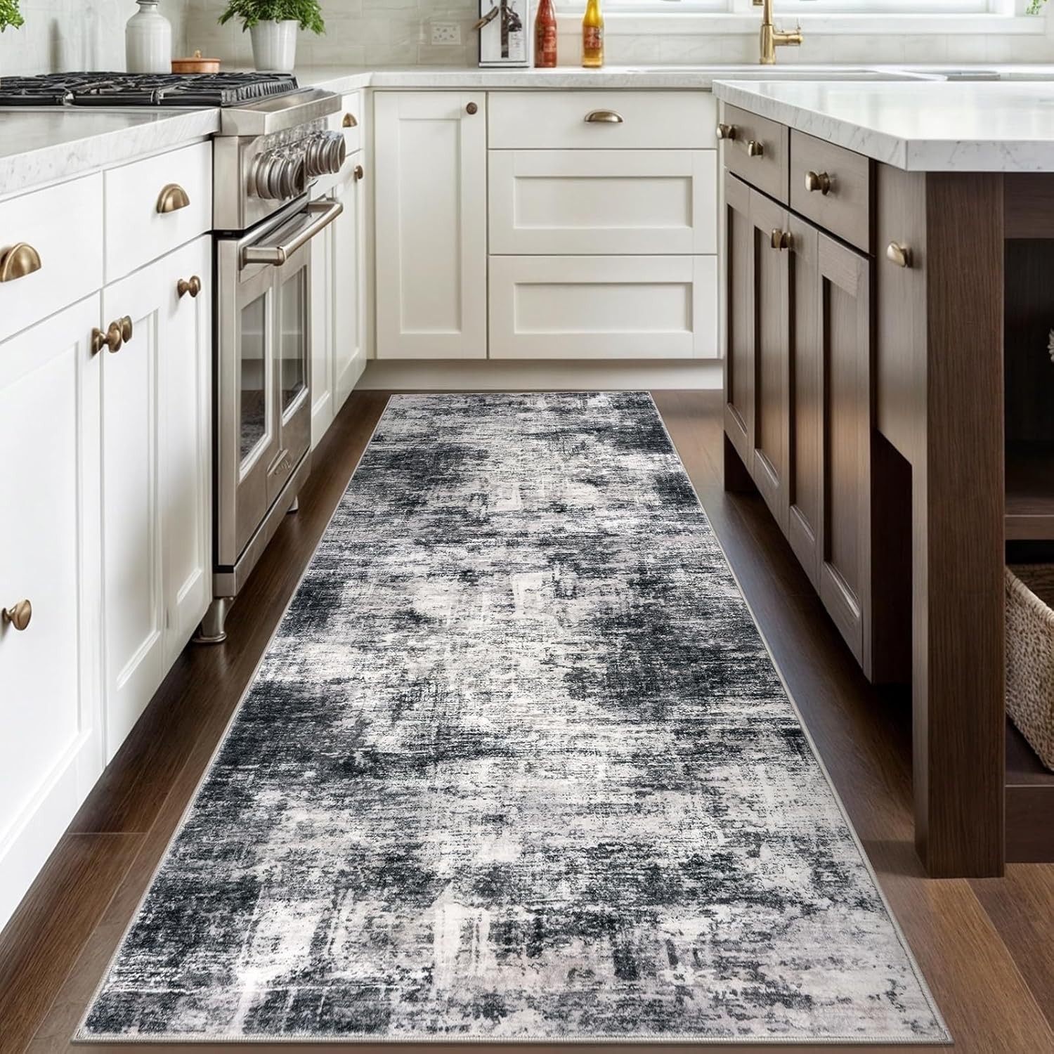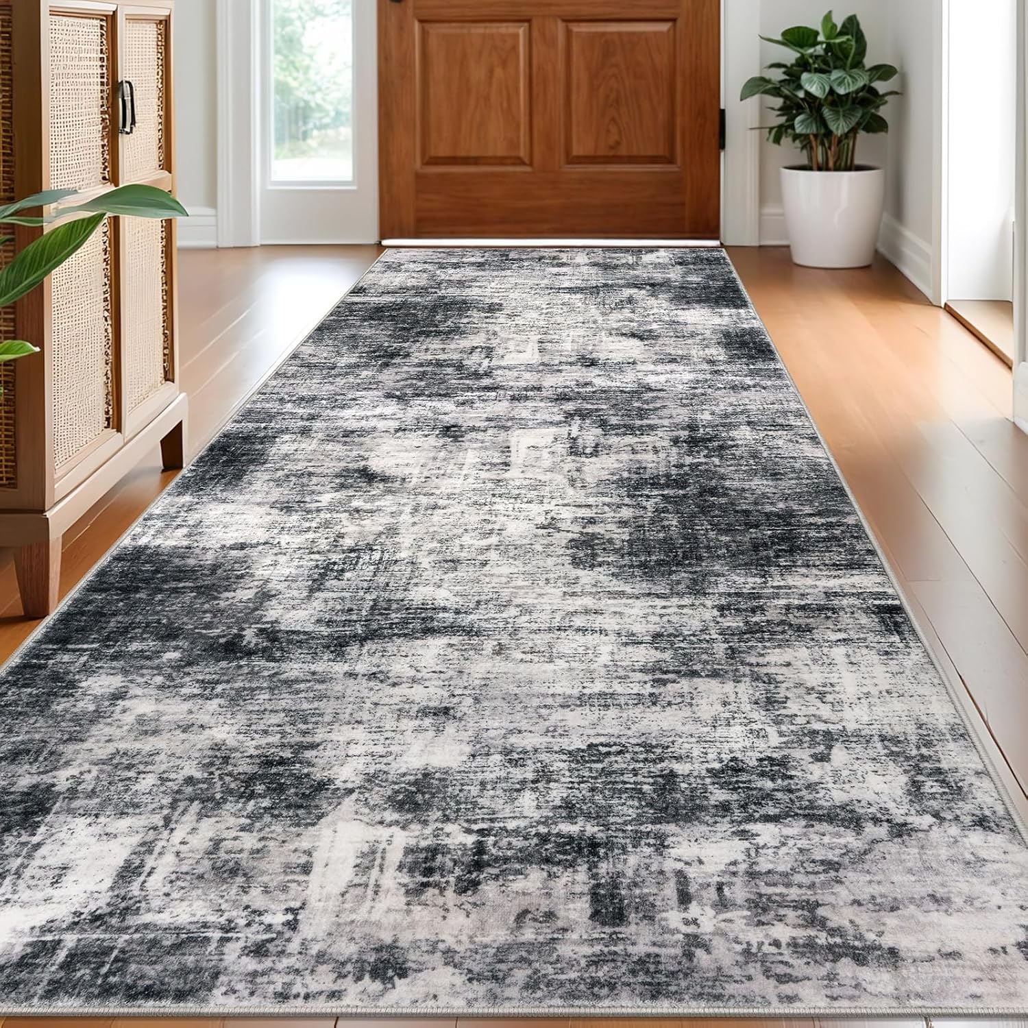 IOHOUZE Abstract Runner Rug 3x8 Ft Washable Runners for Hallways, Non Slip Kitchen Runner Printed Faux Wool Entryway Runner Indoor, Modern Abstract Floor Carpet for Hall Kitchen Bedroom, Black Grey