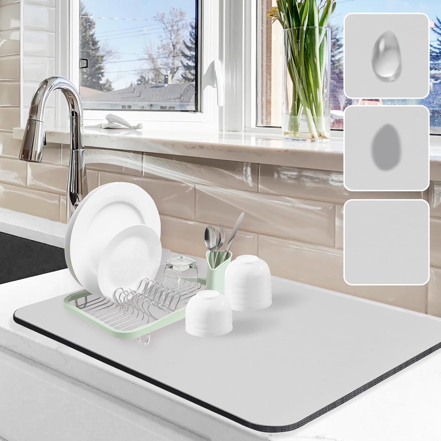 - Anti-slip: The natural rubber bottom of the drying mat has a good anti-slip effect. Prevent water from seeping from below and leave stains on the countertop, keep the kitchen countertop clean for a long time.