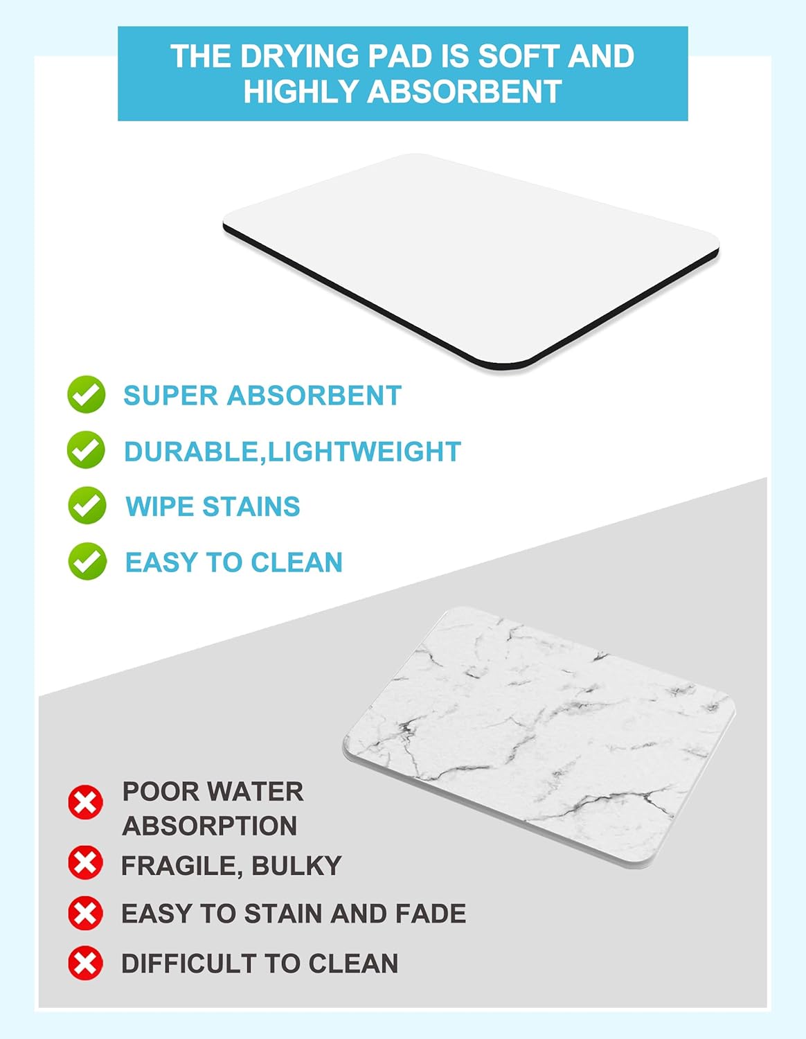 - Super Absorbent: Dish Drying Pad is made of super absorbent nano, the drying pad is soft and highly absorbent, which can dry quickly. In addition, the drying mat is thick enough to better protect countertops, tableware, and glassware from damage and contamination.