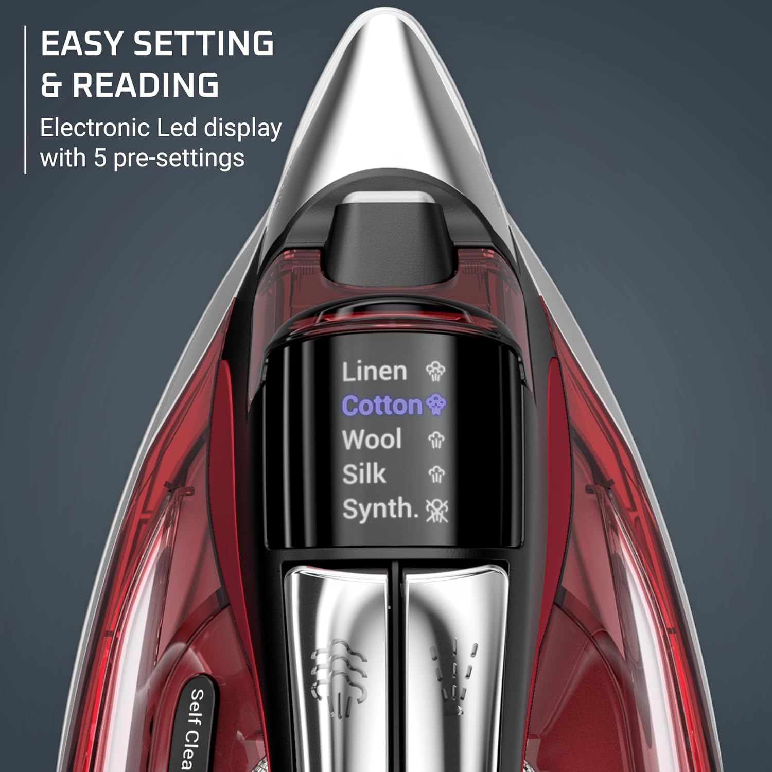 - EASY CONTROL WITH LED DISPLAY: An LED screen with 5 fabric presets on this clothes iron lets you select the ideal setting effortlessly, ensuring perfect results on all garments