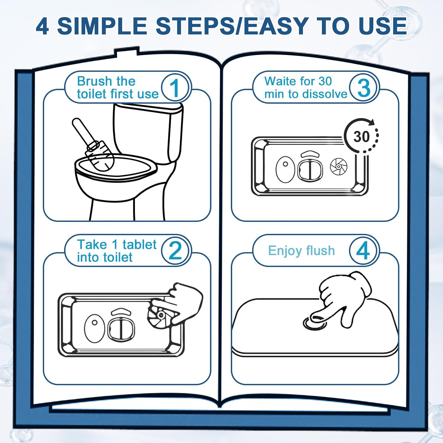 - EASY TO USE: Before first use, deep clean your toilet with a brush. Then open the package and drop one tablet directly into the toilet tank, it will slowly release the cleaning solution (please note, do not remove the water-soluble blue protective film that wraps around the tablet, it prevents from staining your hands) After 20 minutes, the blue water will appear and there will be no need to bother. Wait for several days, the blue solution disappears, you can put in a new cleaning tablet