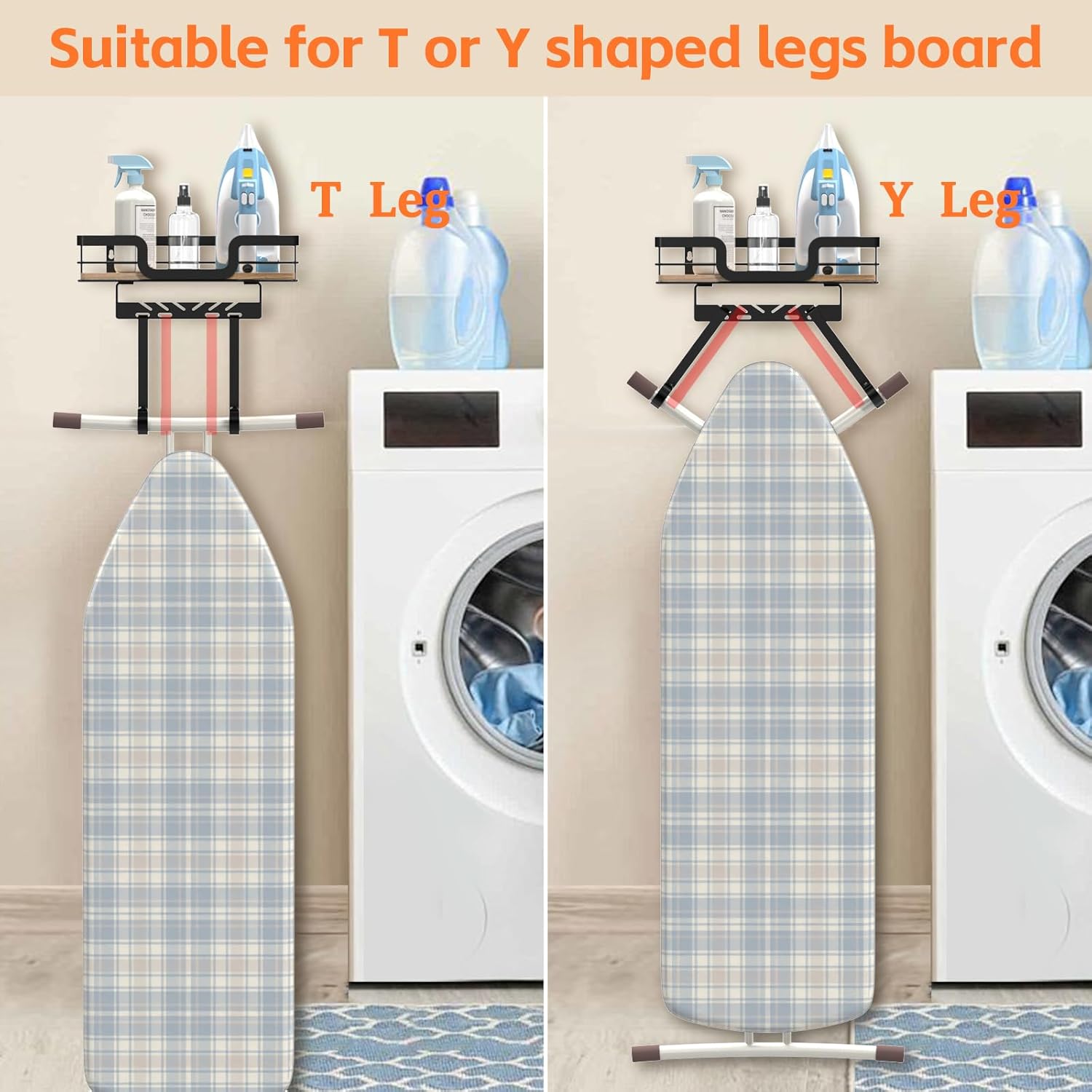 - ADJUSTABLE T&Y SHAPED LEG BOARDS: Paroto laundry room organization ironing board hanger measure 12.4'' x 6.3'' x 2.9'' with 2 hooks under the basket at a height of 6''. Holds up to 30 lbs. Two adjustable long metal hooks for T&Y style leg boards.Laundry accessories for laundry room, farmhouse bathroom decor.