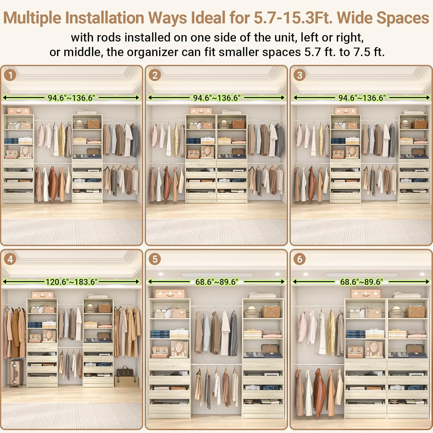 - Aheaplus Closet System, 6-15Ft Closet Organizer with 8 Wooden Drawers, Wood Closet Organizer System with Tower, Walk-in Closet Organizer Wardrobe Garment Clothes Rack with 4 Hanging Rods, White Oak