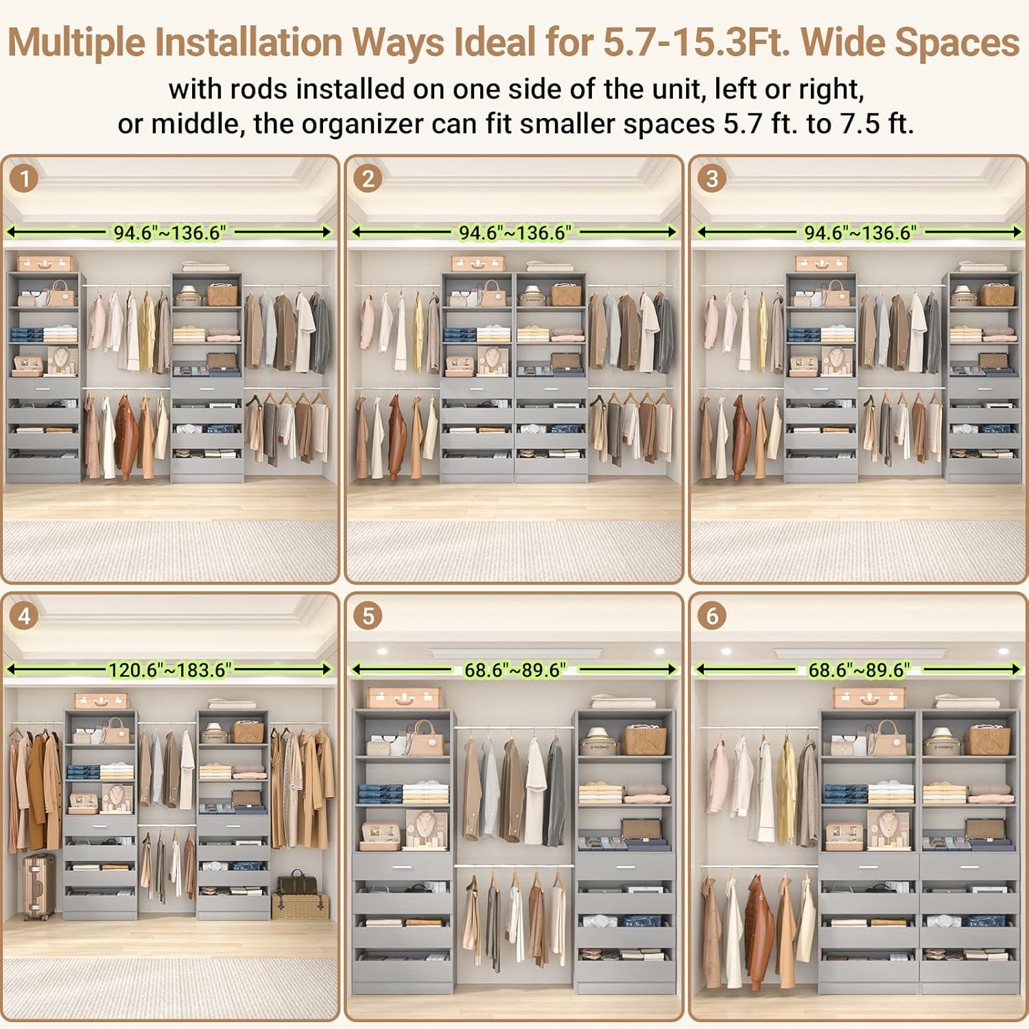 - 【Customize and DIY Your Dream Walk-in Closet】With 4 expandable hanging rods and 2 closet towers, you can easily create a personalized closet system tailored to your space. Home organization system for closet spaces to store shirts, jackets, sweaters, pants, shoes, or other décor items. Multiple Installation Ways Ideal for 6-15Ft. Wide Spaces.