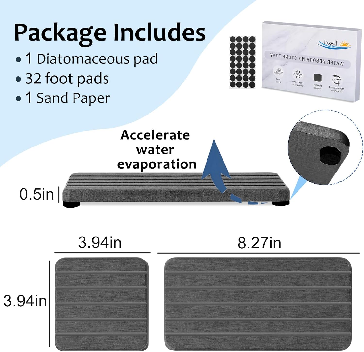 - Perfect Size & 3-pieces --- Our diatomaceous mud coasters are thicker and larger than other products. Packaging Includes: 1 piece pad of 8.27 inches * 3.94 inches * 0.5 inches (21 cm * 10 cm * 1.25 cm); 2 pieces pads of 3.94 inches * 3.94 inches * 0.5 inches (10 cm * 10 cm * 1.25 cm); Silicone anti slip pad * 32; 2 pieces of sandpaper. They can meet your different needs.