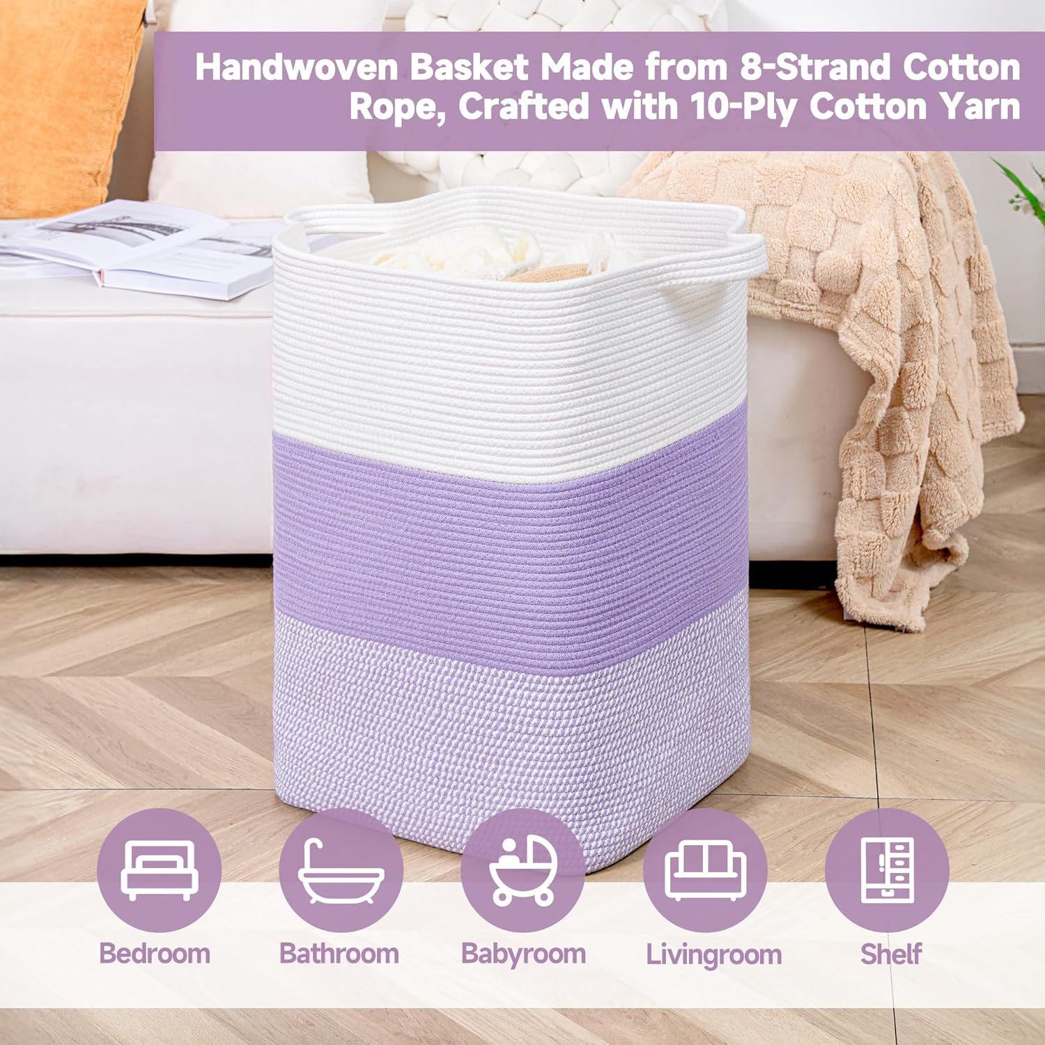CLHMILY&Z 95L Laundry Basket Rectangular Lavender Rope - 16x15x24 Inches - Dirty Clothes and Soft Storage Bin for Blankets, Toys, and Nursery Essentials