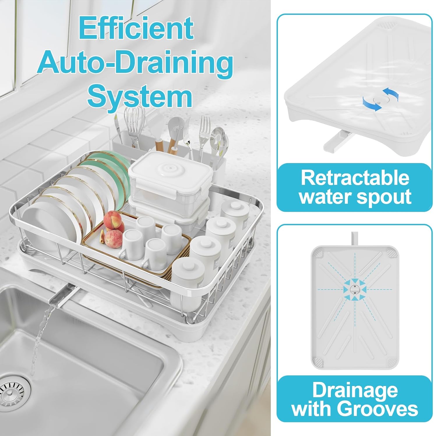 Dish Drying Rack 304 Stainless Steel Dish Racks,Adjustable Spout Auto-Draining Dish Drainers for Kitchen Counter, Large Capacity Dish Rack for Bowls, Cups, White