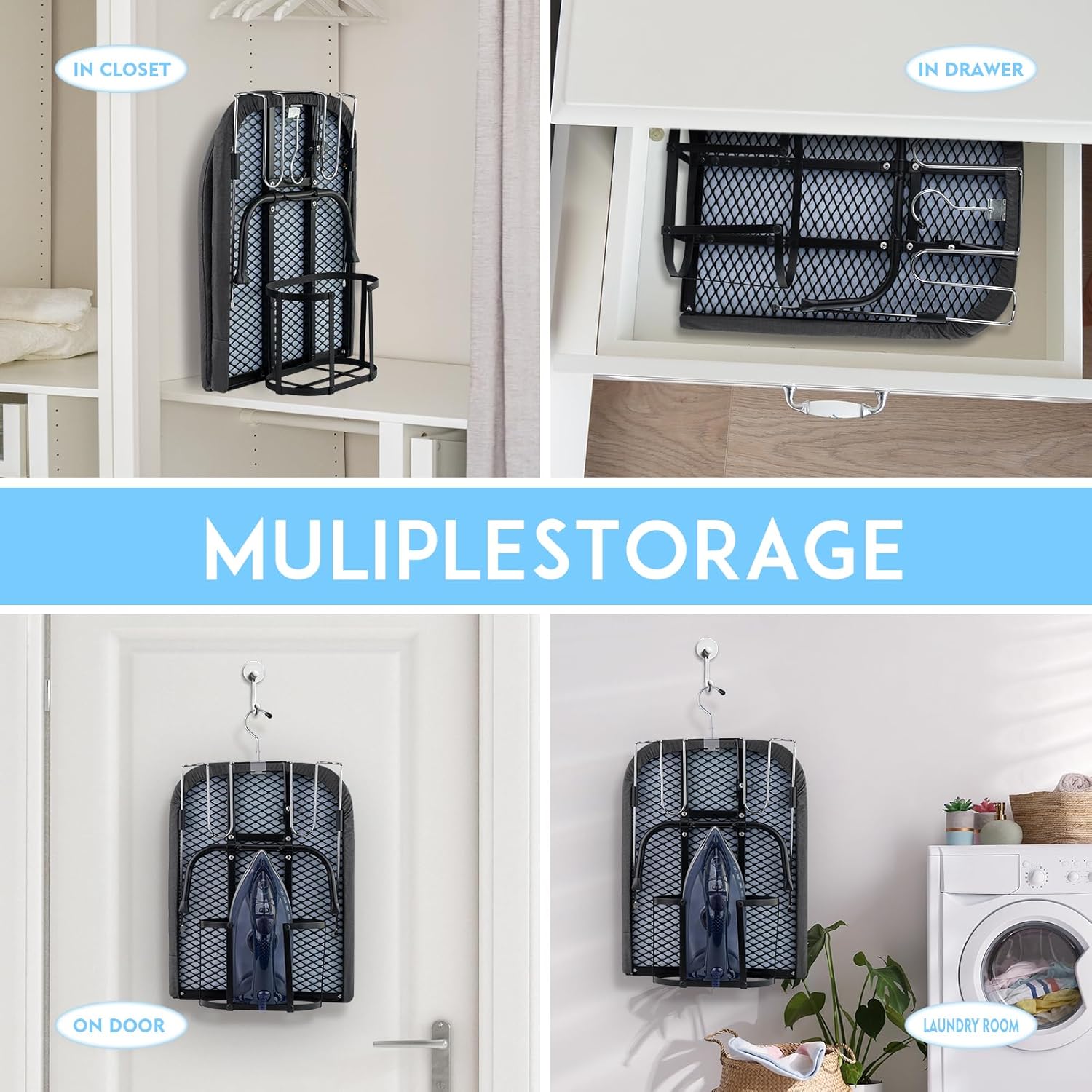 - SPACE SAVING MULTI- Scene Hero- this tabletop ironing board fits seamlessly into laundry rooms, dorm closets, or luggage. Its ultra-slim profile slides under beds, tucks into cabinets, or hangs vertically with the built-in elastic hook – perfect for apartments, RVs, or hotel stays.