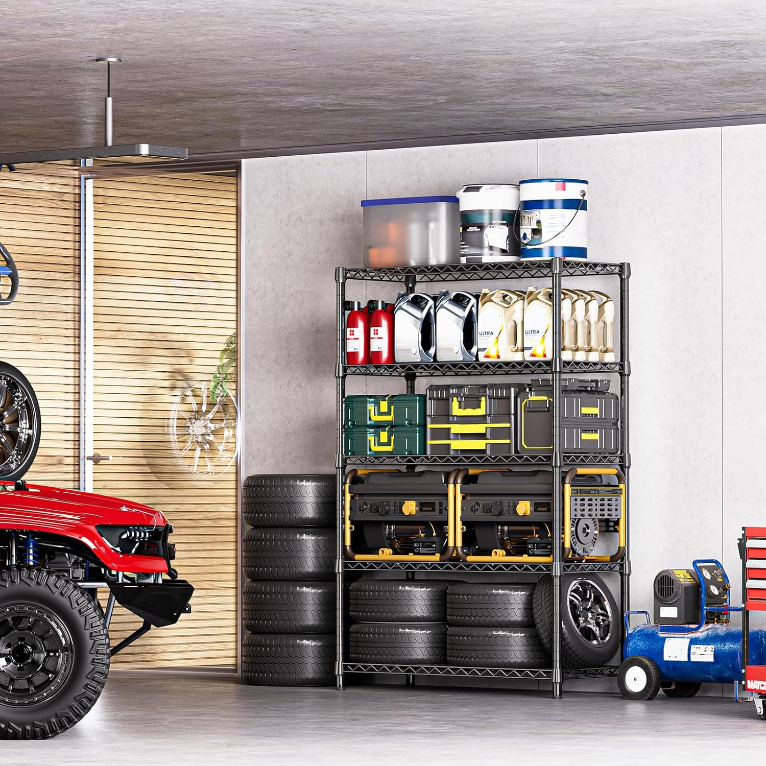 - ăHeavy-Duty Carbon Steel â Ultra-Stable DesignăBuilt with premium carbon steel and 22.22mm reinforced pipes, this shelving rack is engineered for strength and durability. Each shelf supports up to 350 lbs, with a total capacity of 1750 lbs, offering solid support for your heavy tools, appliances, or storage bins.