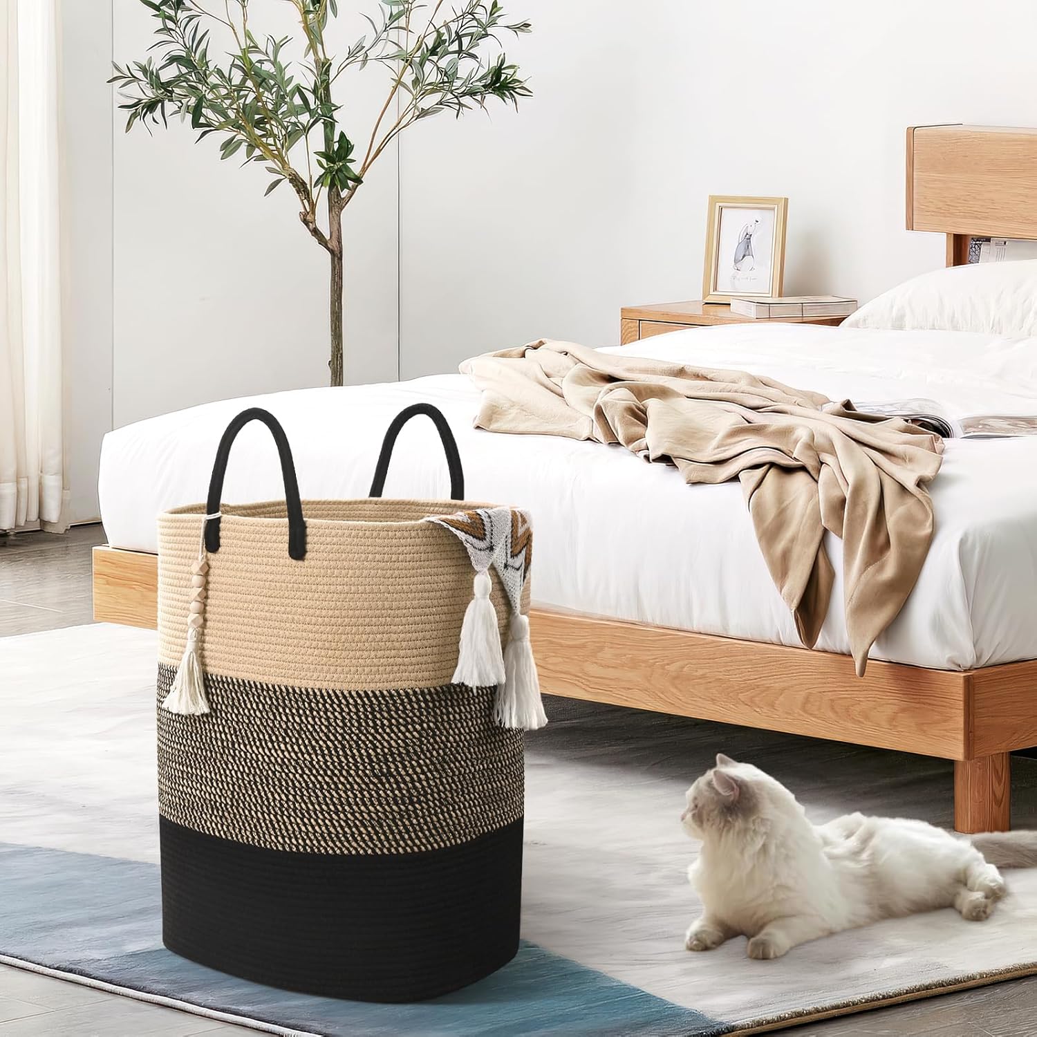 - š[DURABLE, BREATHABLE & SKIN - FRIENDLY COTTON]: Made of sturdy and odor-free rope cotton, woven laundry basket has a solid addition to any space. Tall laundry basket quite sturdy and spacious, capable of holding a good amount without losing its shape, which adds to its practicality.