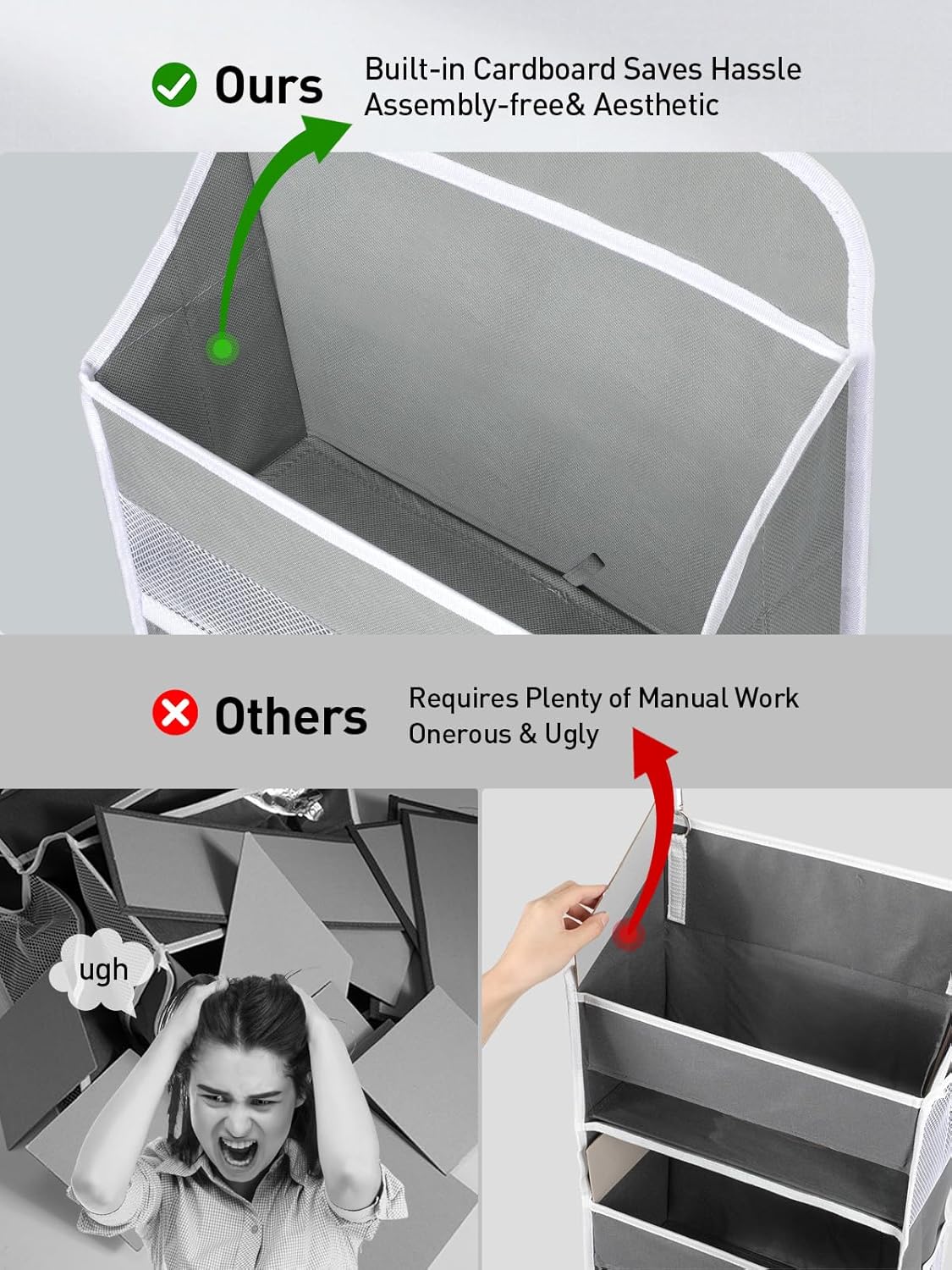 - Tool-free Assembly: No need to insert cardboard in the pockets as required by other behind the door organizer! For your convenience, we have pre-installed the cardboard in the pockets. Simply hang it up and insert the cardboard into the bottom. Enjoy a hassle-free installation process and easily organize your space. Once you have installed the door organizer, you can say goodbye to clutter and welcome a neat and tidy living space.