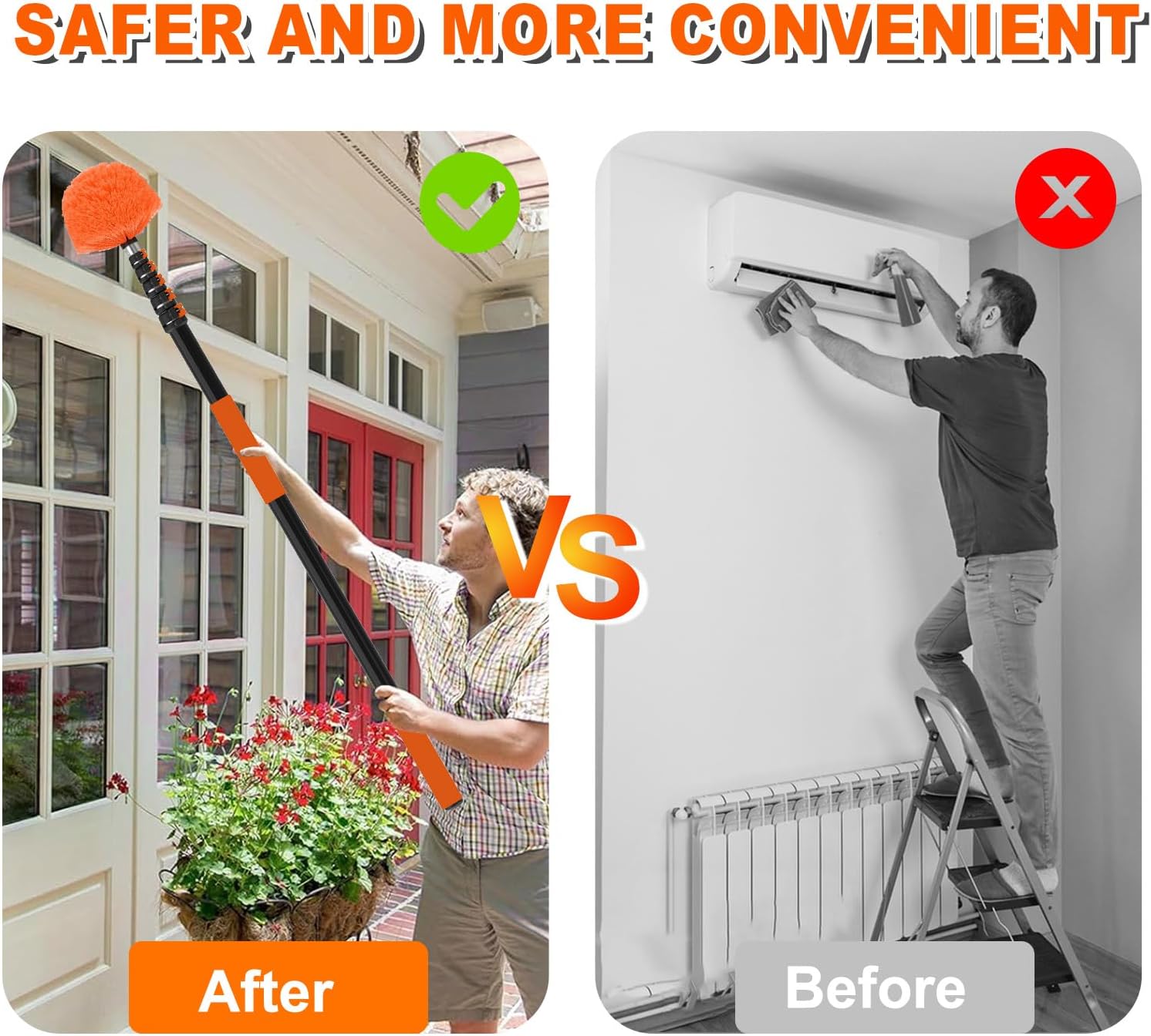 - Ultra-Long Adjustable Extension Pole for Effortless High Reach: This cobweb duster with extension pole features a telescoping pole that can be adjusted from 5FT to 24FT, reaching up to 30FT. Our long duster allows easy cleaning of ceilings up to 30 feet to meet various height requirements. Made of lightweight aluminum, the spider web brush with pole ensures stability and easy handling, making it an ideal tool for cleaning hard-to-reach indoor and outdoor spots like corners and fans. It's an excellent high ceiling duster.
