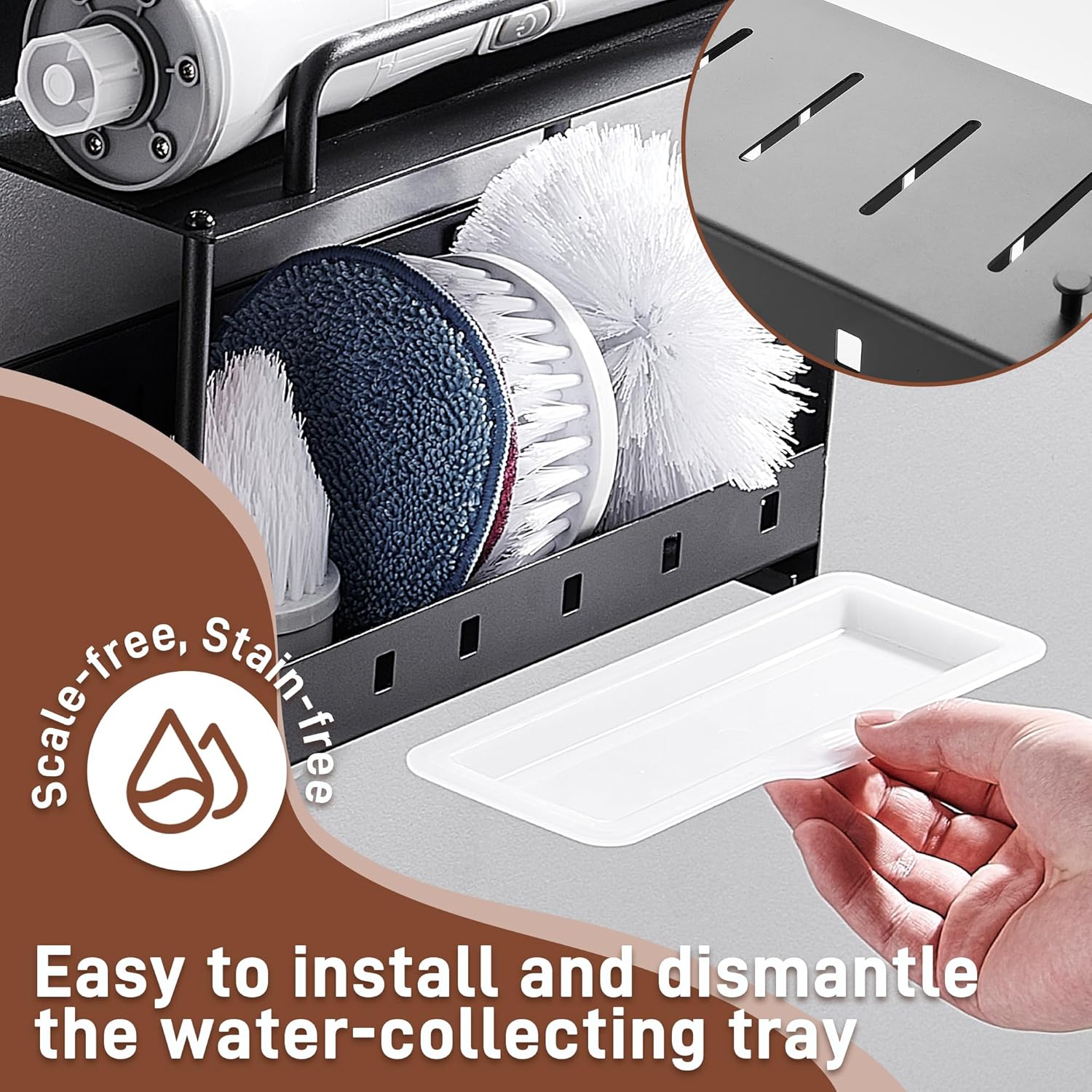 - VERSATILE DESIGN: Wall-mounted or countertop cleaning tool organizer with guardrail-type shelving and water-collecting tray for neat storage of brushes and cleaning supplies