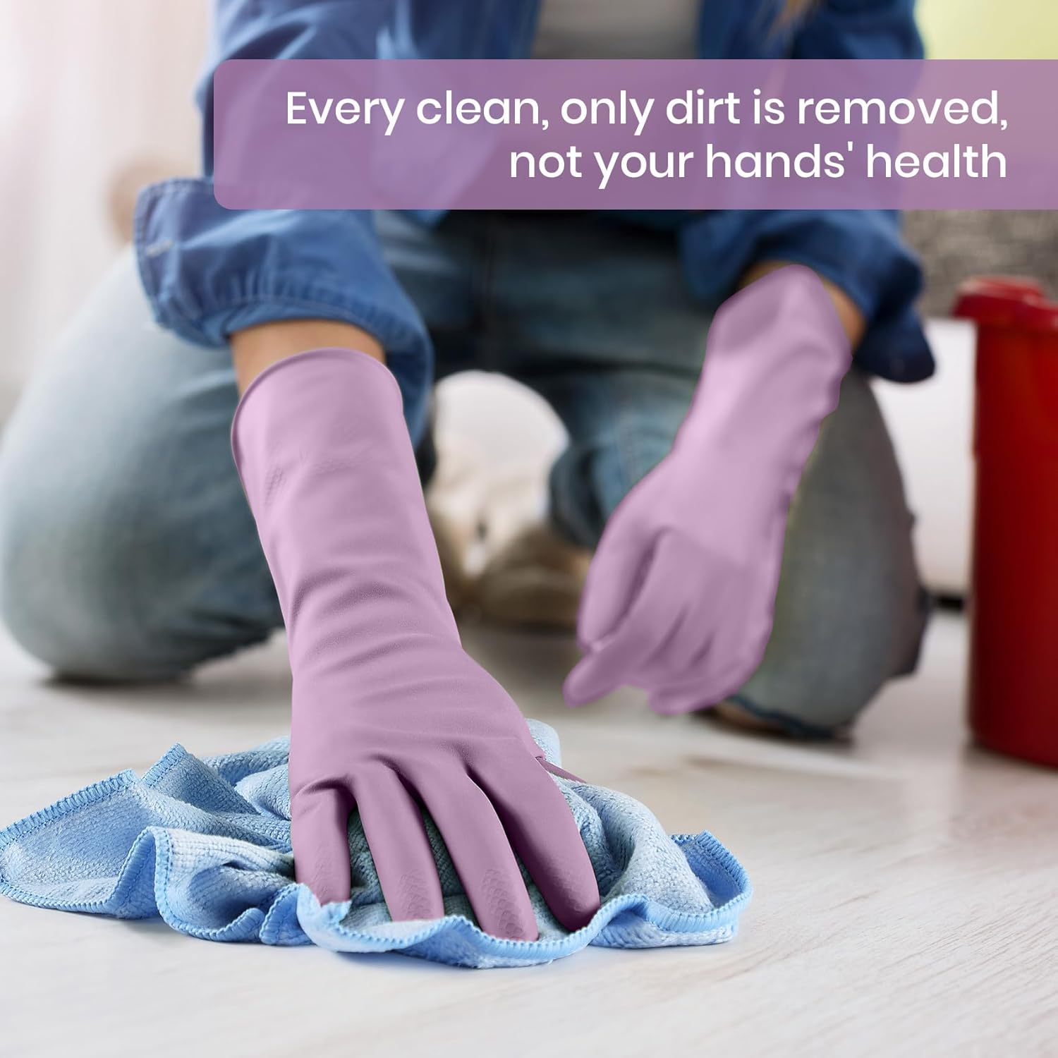 - Your Reliable Cleaning Companion: Our cleaning gloves are made of premium, skin-friendly natural rubber. Whether you're washing dishes or tackling other cleaning tasks, they shield your hands from harsh chemicals like bleach and other harmful liquids. These gloves make tough cleaning tasks safer, easier, and more manageable, delivering unmatched reliability for your daily home chores.