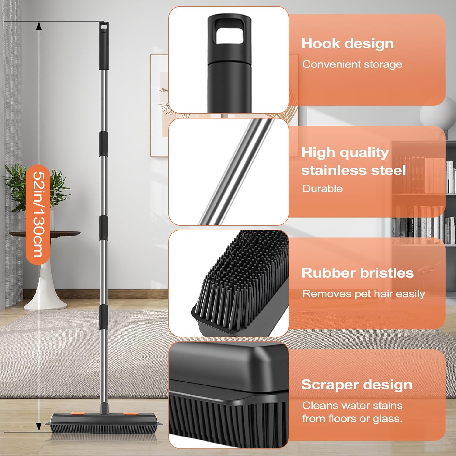 - EFFICIENT PET HAIR REMOVAL: Featuring a high-quality, durable rubber brush head, the pet hair removal broom effectively captures and removes pet hair from carpets and hard floors, helping to maintain a cleaner home environment for pet owners.
