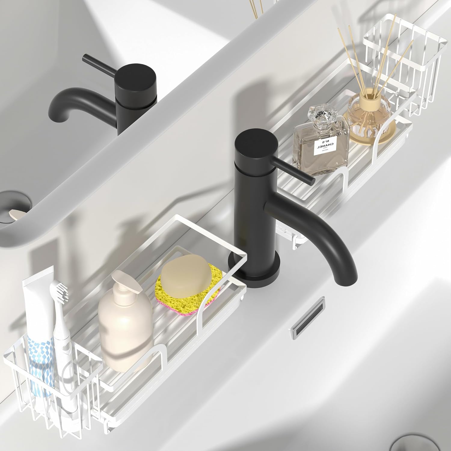 - VERSATILE DESIGN: Kitchen sink caddy organizer with dedicated compartments for sponges, scrubbers, soap dispenser, and other cleaning supplies