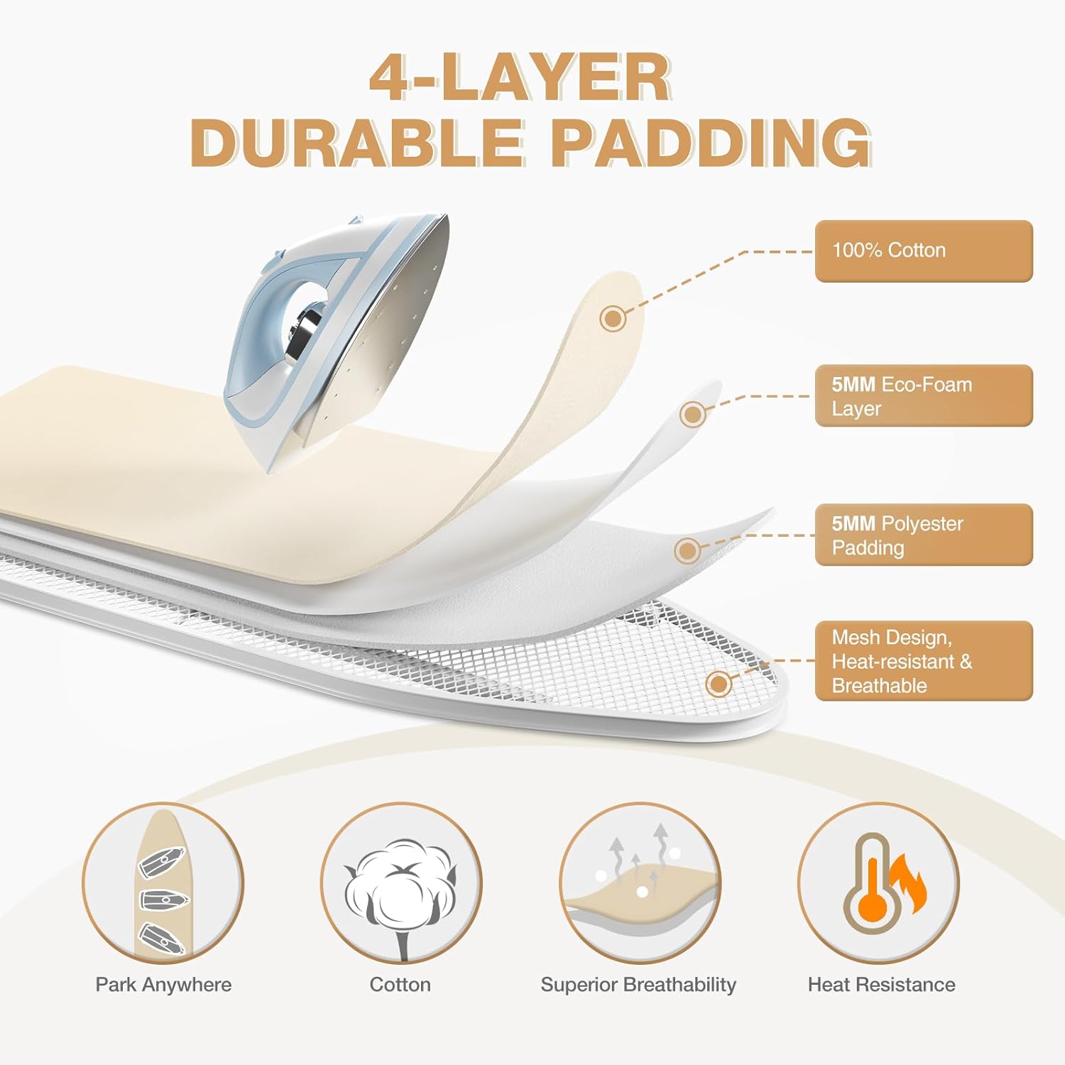 - Removable 100% Cotton Cover – Soft yet smooth surface for effortless ironing; padded with cotton filling for enhanced comfort and heat retention.