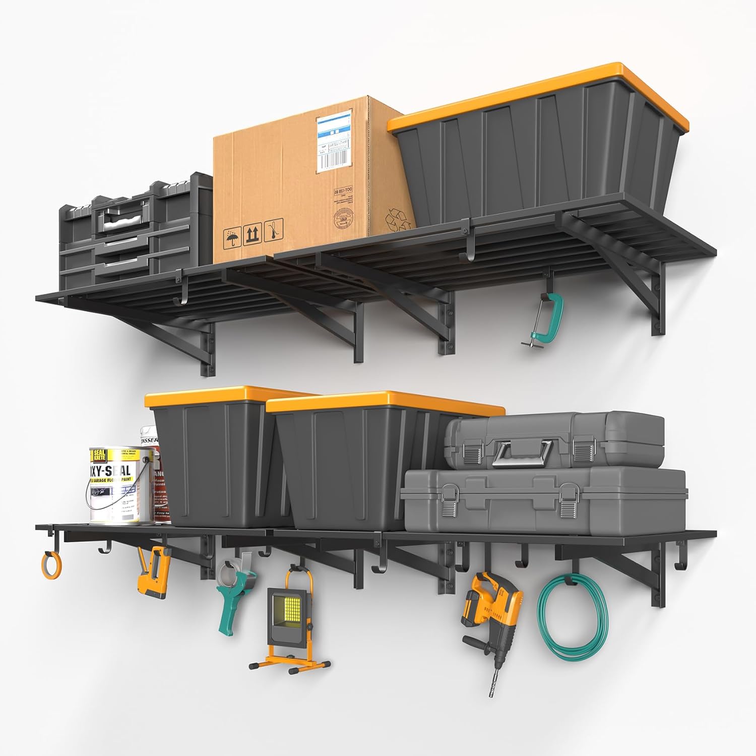 - HEAVY-DUTY GARAGE SHELVING: Our 4-Pack wall-mounted shelves provide generous storage, featuring two 2'x3' shelves per unit. Built from heavy-duty steel, each shelf holds up to 200 lbs, offering a combined capacity of 800 lbs. Ideal for garages, warehouses, offices, and beyond, these shelves are designed for durability, stability, and efficient space organization