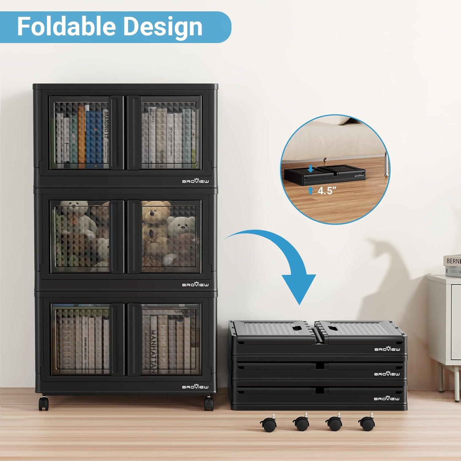 BROVIEW 400 Qt Stackable Storage Bins with Lids & Doors, 4 Pack Plastic Closet Organizer and Storages Drawers with Wheels, Large Collapsible Storages Boxes, Cabinet for Home, Office, V10, Black