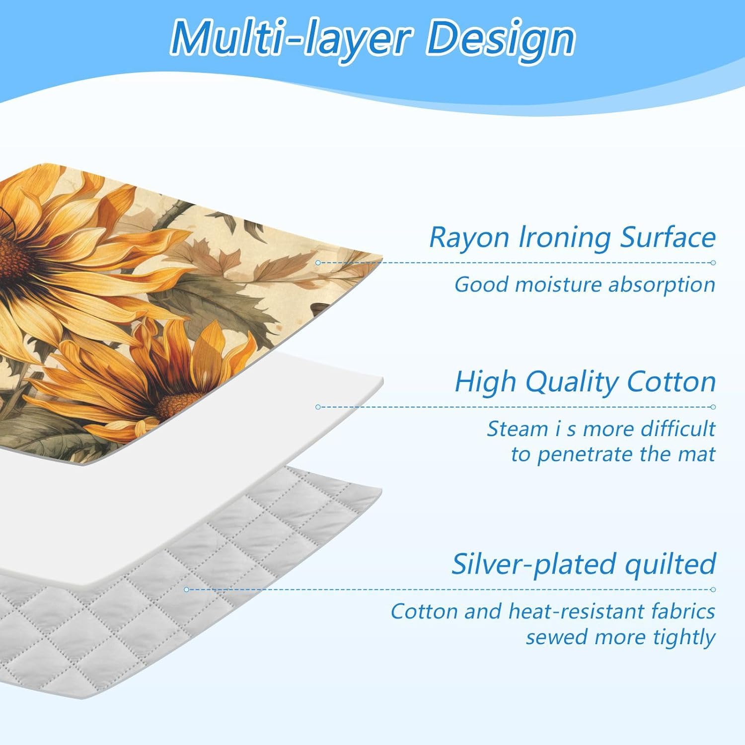 - Premium Quality Material: Crafted from high-quality cotton and heat-resistant fabric with silver quilting, our ironing blanket protect your clothes and ensures your cloth tabletop stay safe from heat damage