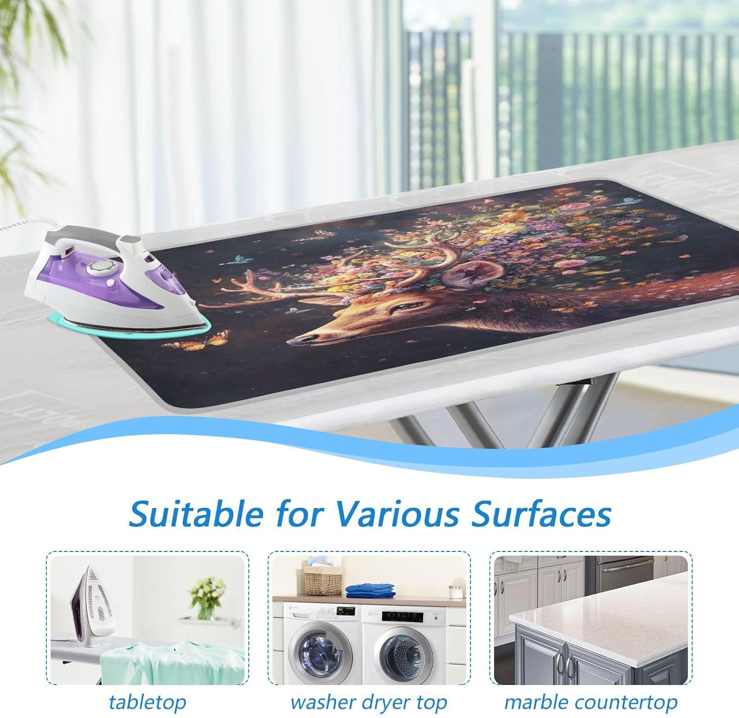 - Use Widely : Suitable for use on any flat surface, such as tabletops, washer or dryer tops, marble countertops, in compact spaces, RVs, or during travel. It also serves as a heat-resistant cover pad, protecting surfaces from dust, scratches and minor damages